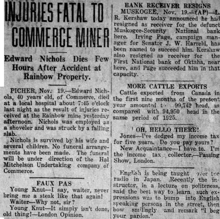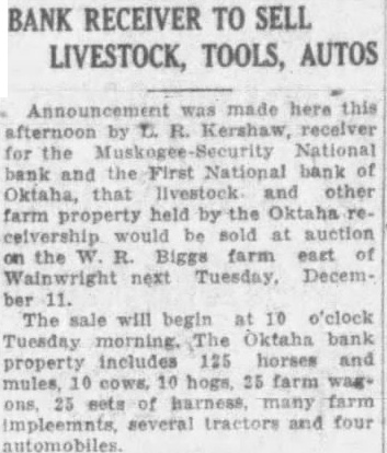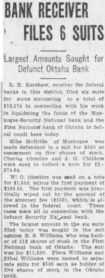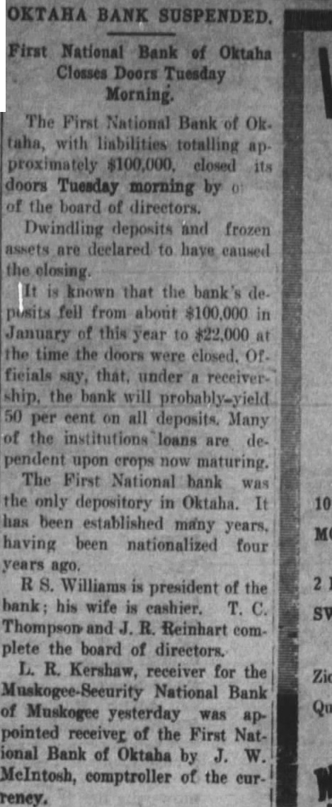 OKTAHA BANK SUSPENDED. First National Bank of Oktaha Closses Doors Tuesday The First National Bank of Ok. taha, with liabilities totalling approximately $100,000, closed its doors Tuesday morning by of the board of directors. Dwindling deposits and frozen assets are declared to have caused the closing. It is known that the bank's deposits fell from about $100,000 in January of this year to $22,000 at the time the doors were closed. Of. ficials say, that. under a receivership, the bank will probably-yield. 50 per cent on all deposits. Many of the institutions loans are dependent upon crops now maturing. The First National bank was the only depository in Oktaha. It has been established many years, having been nationalized four years ago. R Williams is president of the bank; his wife is cashier. T. C. Thompson and J. R. Reinhart complete the board of directors. L. R. Kershaw, receiver for the Muskogee-Security National Bank of Muskogee yesterday was appointed receiver of the First National Bank of Oktaha by J. W. MeIntosh, comptroller of the cur-