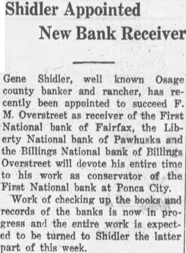 Appointed New Bank Receiver Gene Shidler, well known Osage county banker and rancher, has cently been appointed to succeed M. Overstreet as receiver of the First National bank of Fairfax, the Liberty National bank of Pawhuska and the Billings National bank of Billings Overstreet will devote his entire time to his work as conservator of the First National bank at Ponca City. Work of checking up the books and records of the banks is in progress and the entire work is expected to be turned to Shidler the latter part of this week.