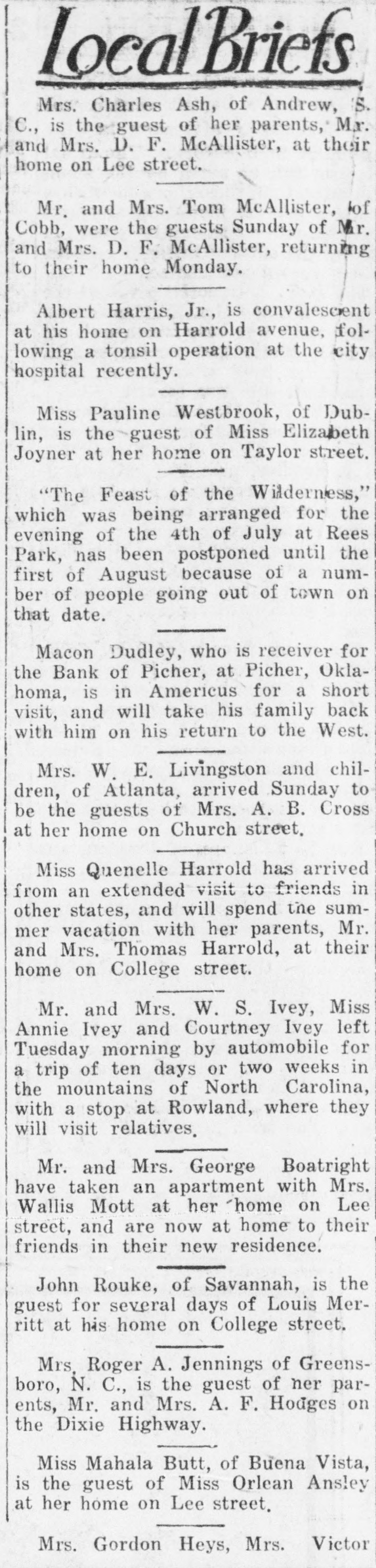 # Local Briefs Mrs. Charles Ash, of Andrew, S. C., is the guest of her parents, Mr. and Mrs. D. F. McAllister, at their home on Lee street. Mr. and Mrs. Tom McAllister, of Cobb, were the guests Sunday of Mr. and Mrs. D. F. McAllister, returning to their home Monday. Albert Harris, Jr., is convalescent at his home on Harrold avenue, fol- lowing a tonsil operation at the city hospital recently. Miss Pauline Westbrook, of Dub- lin, is the guest of Miss Elizabeth Joyner at her home on Taylor street. "The Feast of the Wilderness," which was being arranged for the evening of the 4th of July at Rees Park, nas been postponed until the first of August because of a num- ber of people going out of town on that date. Macon Dudley, who is receiver for the Bank of Picher, at Picher, Okla- homa, is in Americus for a short visit, and will take his family back with him on his return to the West. Mrs. W. E. Livingston and chil- dren, of Atlanta, arrived Sunday to be the guests of Mrs. A. B. Cross at her home on Church street. Miss Quenelle Harrold has arrived from an extended visit to friends in other states, and will spend the sum- mer vacation with her parents, Mr. and Mrs. Thomas Harrold, at their home on College street. Mr. and Mrs. W. S. Ivey, Miss Annie Ivey and Courtney Ivey left Tuesday morning by automobile for a trip of ten days or two weeks in the mountains of North Carolina, with a stop at Rowland, where they will visit relatives. Mr. and Mrs. George Boatright have taken an apartment with Mrs. Wallis Mott at her home on Lee street, and are now at home to their friends in their new residence. John Rouke, of Savannah, is the guest for several days of Louis Mer- ritt at his home on College street. Mrs, Roger A. Jennings of Greens- boro, N. C., is the guest of ner par- ents, Mr. and Mrs. A. F. Hodges on the Dixie Highway. Miss Mahala Butt, of Buena Vista, is the guest of Miss Orlean Ansley at her home on Lee street. Mrs. Gordon Heys, Mrs. Victor
