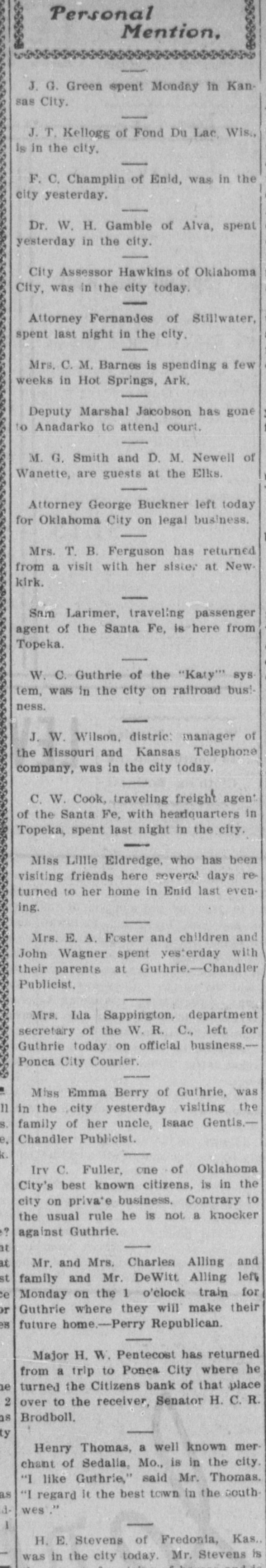 Personal Mention, J. G. Green spent Monday in Kansas City. J. T. Kellogg of Fond Du Lac Wis, Is in the city, F. C. Champlin of Enid, was in the city yesterday. Dr. W. H. Gamble of Alva, spent yesterday in the city. City Assessor Hawkins of Oklahoma City, was in the city today. Attorney Fernandes of Stillwater, spent last night in the city. Mrs. C. M. Barnes is spending a few weeks in Hot Springs, Ark. Deputy Marshal Jacobson has gone to Anadarko to attend court. M. G. Smith and D. M. Newell of Wanette, are guests at the Elks. Attorney George Buckner left today for Oklahoma City on legal business. Mrs. T. B. Ferguson has returned from a visit with her sister at New kirk. Sam Larimer, traveling passenger agent of the Santa Fe, is here from Topeka. W. C. Guthrie of the "Katy" sys tem, was in the city on railroad bus! ness. J. W. Wilson, distric: manager of the Missouri and Kansas Telephone company, was in the city today. C. W. Cook, traveling freight agent of the Santa Fe, with headquarters in Topeka, spent last night in the city. Miss Lillie Eldredge, who has been visiting friends here several days returned to her home in Enid last even. ing. Mrs. E. A. Foster and children and John Wagner spent yesterday with their parents at Guthrie.-Chandler Publicist. Mrs. Ida Sappington. department secretary of the W. R. C., left for Guthrie today on official business Ponca City Courier. Miss Emma Berry of Guthrie, was 11 in the city yesterday visiting the S. family of her uncle, Isaac Gentis.Chandler Publicist. Irv C. Fuller, one of Oklahoma City's best known citizens, is in the city on private business. Contrary to the usual rule he is not a knocker against Guthrie. at at Mr. and Mrs. Charles Alling and family and Mr. DeWitt Alling left ce Monday on the 1 o'clock train for or Guthrie where they will make their BE future home.-Perry Republican. Major H. W. Pentecost has returned from a trip to Ponca City where he 1e turned the Citizens bank of that place 2 over to the receiver, Senator H. C. R. as Brodboll. ty Henry Thomas, a well known merchant of Sedalia, Mo., is in the city. "I like Guthrie," said Mr. Thomas. as "I regard It the best town in the south wes." H. E. Stevens of Fredonia, Kas. was in the city today. Mr. Stevens is