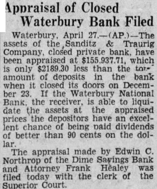 Appraisal of Closed Waterbury Bank Filed Waterbury, April The of Sanditz Traurig Company closed bank. have appraised which less than the the bank doors on December If National the to date the assets appraised prices the depositors have excelbeing of better than 90 cents on the dol- The appraisal made by Edwin Northrop Dime Savings Attorney Frank Healey filed today with clerk of Superior Court.