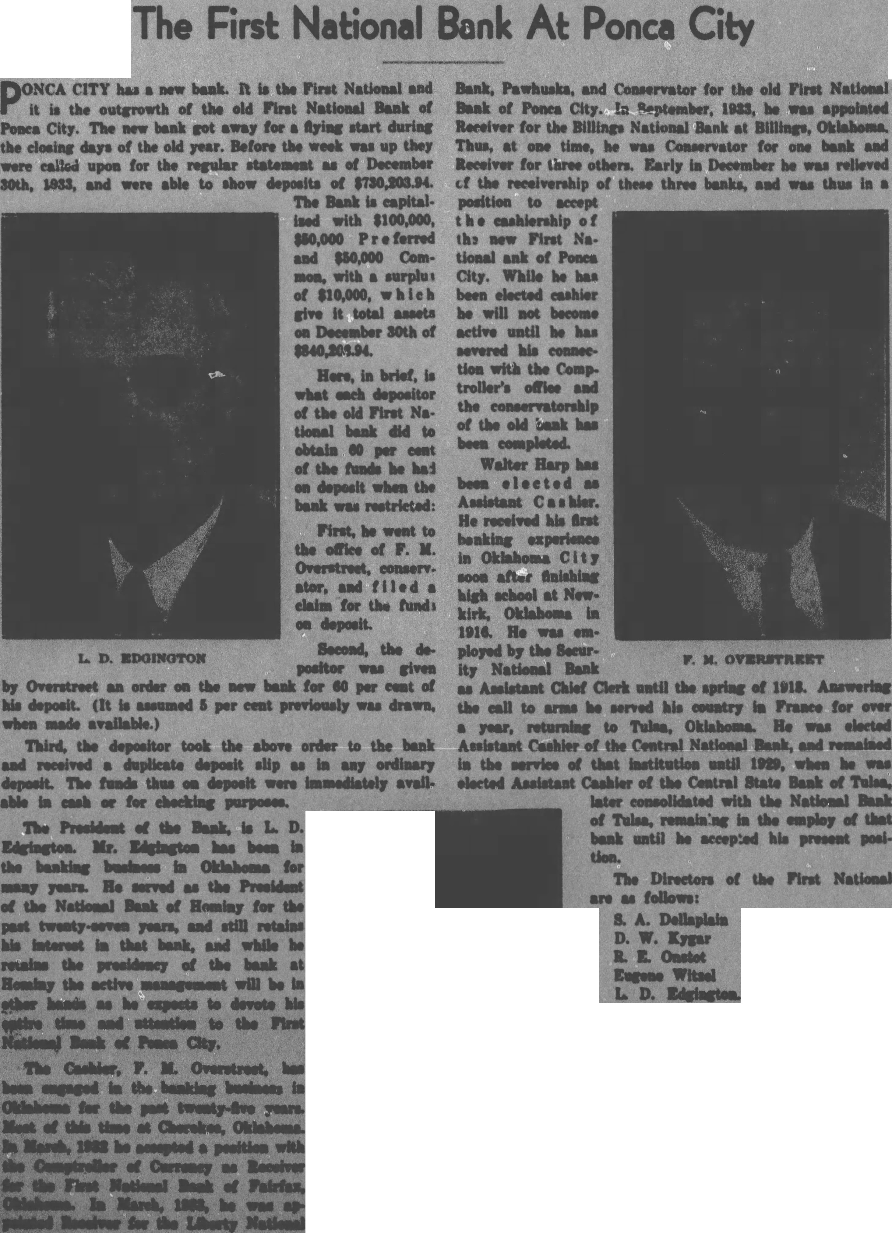 CAPPS CASE PROBE PONCA ENDED INVESTIGATORS ED ELSEWHERE; CHECK RECORDS FOR SHORTAGE Conviction of Frank Capps, former assistant cashier of the First National bank of making false entries, apparently closes the investigation of the department of justice here, was learned Saturday. Word has been received by Frank M. Overstreet, conservator in charge, that may put away records being checked. It has also been learned that W. S. Rich, department justice agent, who made the investigation here, has been sent to California. Withdrawal of the department is further indication that there basis for the rumor that Capps may have had confederate. Capps is now in Leavenworth where he is serving five-year term in the federal penitentiary. The total shortage that he admits exists in his department amounts to $26,000. He pleaded guilty to making false entries and admits using some $6,000 of the bank's money but he has explained what went with the balance the money. He did deny taking it. Need Proof For Bond Money The bank was protected by bond of $15,000. It will be necessary to show proof that Capps took this amount of money order to collect. Accountants are beginning a further check of the records in order to trace all shortages. It is believed, with the beginning that has been made, that they will have no great difficulty. As soon as the evidence is collected, claim will be filed with the bonding company. No further word has been received from the Fidelity National bank at Kansas City, open now on five per cent restricted basis. Since the closing efforts have been made to open the bank so that depositors might be paid in full. The bank served as depository for many small banks, nearly 500, which the First National here was one of the largest. It carried some $78,000 when the bank closed. is known that the Fidelity paid out because of heavy some $16,000,000 its $36,000,000 deposits before closed. This fact has made somewhat difficult to effect a reorganization. "New" Bank in Operation The local bank has been open for several weeks on five per cent restricted basis. Actually an old and new bank are being operated. The old bank is being liquidated while the new bank transacting general banking business with the exception that no loans are being made. Five per cent of the old deposits have been set over into new accounts in the new bank and new deposits are received on hundred per cent basis. Efforts to reorganize the old bank or to effect an organization of new one still continuing with no new developments.