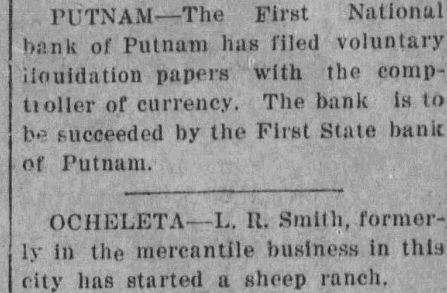 PUTNAM-The First National bank of Putnam has filed voluntary liquidation papers with the comptroller of currency. The bank is to be succeeded by the First State bank of Putnam. OCHELETA-L. R. Smith, formerly in the mercantile business in this city has started a sheep ranch.