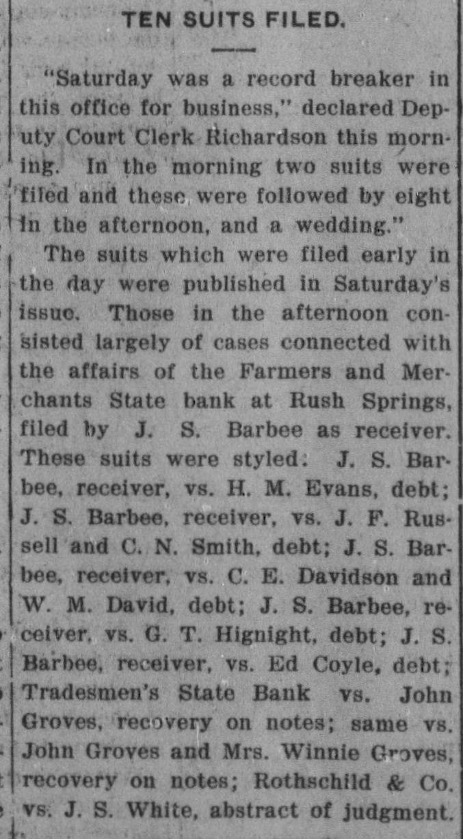 TEN SUITS FILED. "Saturday was a record breaker in this office for business," declared Deputy Court Clerk Richardson this morning. In the morning two suits were filed and these were followed by eight in the afternoon, and a wedding." The suits which were filed early in the day were published in Saturday's issue. Those in the afternoon consisted largely of cases connected with the affairs of the Farmers and Merchants State bank at Rush Springs, filed by J. S. Barbee as receiver. These suits were styled: J. S. Barbee, receiver, vs. H. M. Evans, debt; J. S. Barbee, receiver, vs. J. F. Rus. sell and C. N. Smith, debt; J. S. Barbee, receiver, vs. C. E. Davidson and W. M. David, debt; J. S. Barbee, receiver, vs. G. T. Hignight, debt; J. S. Barbee, receiver, vs. Ed Coyle, debt; Tradesmen's State Bank vs. John Groves, recovery on notes; same vs. John Groves and Mrs. Winnie Groves, recovery on notes; Rothschild & Co. vs. J. S. White, abstract of judgment.
