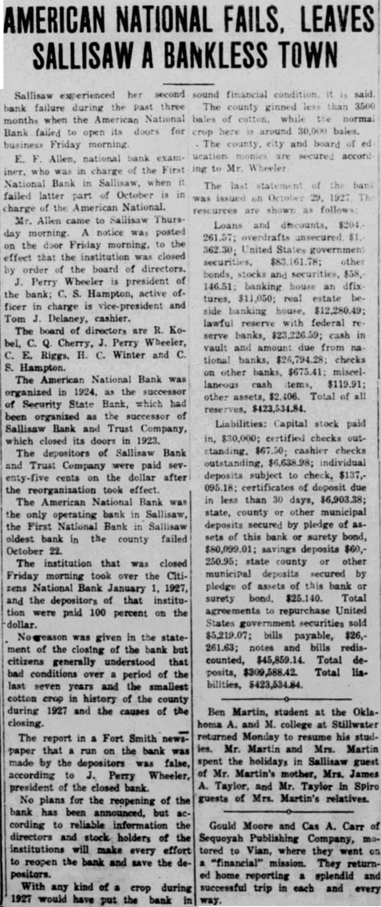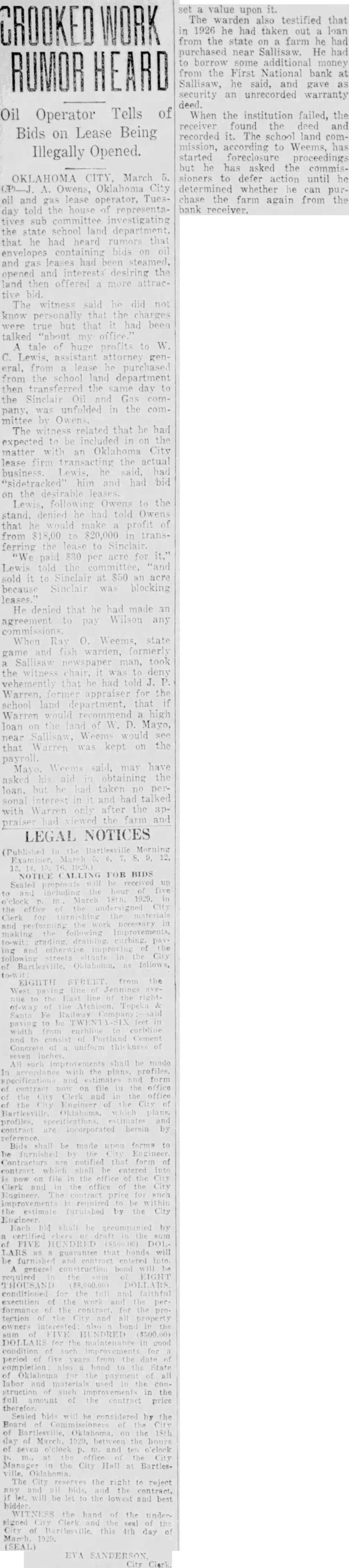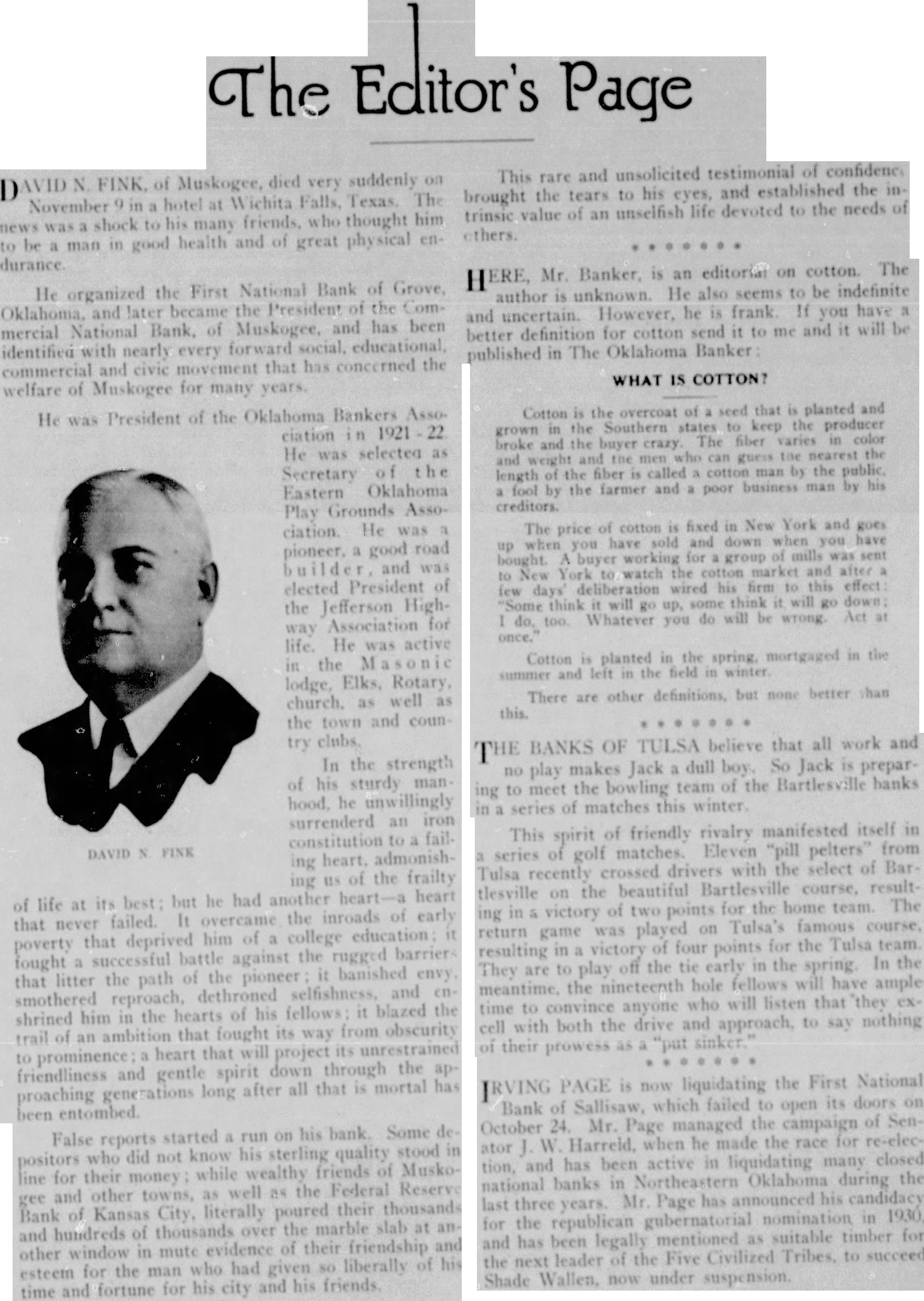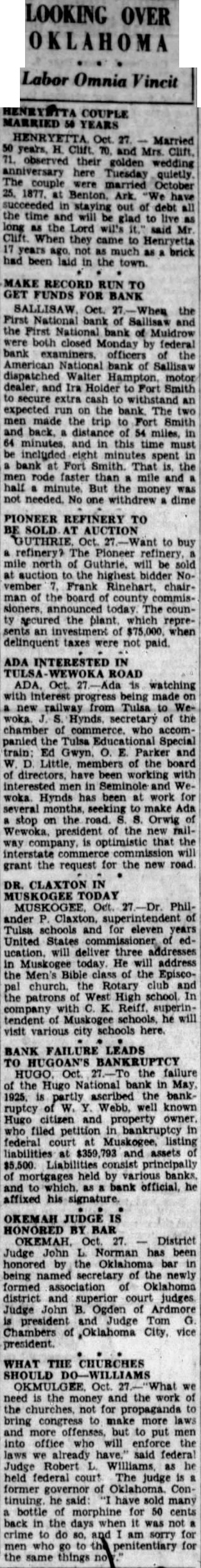LOOKING OVER OKLAHOMA Labor Omnia Vincit HENRY COUPLE MARRIED 50 YEARS Oct. 27. Married 71. observed their golden wedding anniversary The here Tuesday quietly couple were married October 1877 at have the succeeded in staying out of debt all time and will be glad to live long as the Lord Mr said Clift When they came to Henryetta years as much as brick had been laid in the town. MAKE RECORD RUN TO GET FUNDS FOR BANK SALLISAW Oct. -When the First National bank of Sallisaw and the First National bank of Muldrow were both closed Monday by federal bank examiners. officers of the American National bank of Sallisaw dispatched Walter Hampton, motor dealer, and Ira Holder to Fort Smith to secure extra cash to withstand an expected run on the bank. The two men made the trip to Fort Smith and back of 54 miles, in minutes. and in this time must be included eight minutes spent in bank at Fort Smith. That is, the men rode faster than mile and minute But the money was not needed. No one withdrew dime PIONEER REFINERY TO BE SOLD AT AUCTION GUTHRIE Oct. Want to buy refinery? The Pioneer refinery mile north of Guthrie. will be sold at suction to the highest bidder November Frank Rinehart. chairman of the board of county commistoday The county secured the plant. which represents an of when delinquent taxes were not paid. ADA INTERESTED IN TULSA WEWOKA ROAD ADA. Oct. 27-Ada is watching with Interest being made on a new railway from Tulsa to Wewoka S. Hynds. secretary of the chamber of who accompanied the Tulsa Educational Special train: Ed Gwyn. O. E. Parker and W D.1 Little. members of the board of directors. have been working with interested men in Seminole and Wewoka. Hynds has been at work for several seeking to make Ada stop on the road. Orwig Wewoka, of the new railway company is optimistic that the commerc commission will grant the request for the new road DR. CLAXTON IN MUSKOGEE TODAY MUSKOGEE Oct. 27 Dr. Philander Claxton superintendent Tulsa schools and for eleven years United States commissioner of education, will deliver three addresses in Muskogee today. He will address the Men's Bible class of the Episcopal church. the Rotary club and the patrons of West High school. In company with C. K. Reiff. superintendent of schools, he will visit various city schools here. BANK FAILURE LEADS TO HUGOAN'S BANKRUPTCY HUGO. Oct 27.-To the failure of the Hugo National bank in May, 1925. is partly ascribed the bank ruptcy W. Webb, well known Hugo citizen and property owner. who filed petition in bankruptcy in federal court Muskogee listing liabilities at $359,793 and assets Liabilities consist principally of mortgages held by various banks and to which bank official, he affixed his signature. OKEMAH JUDGE IS HONORED BY BAR Oct 27. District Judge John L. Norman has been honored by the Oklahoma bar in being named secretary of the newly formed association of Oklahoma district and superior court judges Judge John B. Ogden of Ardmore is president and Judge Tom G. Chambers of Oklahoma City, vice president. WHAT THE CHURCHES SHOULD -WILLIAMS OKMULGEE Oct. What we need the money and the work of the churches, not for propaganda to bring congress to make more laws and more offenses, but to put men into office who will enforce the laws we already have," said federal Judge Robert Williams as he held federal The judge is former of Oklahoma. Continuing he said have sold many bottle of morphine for 50 cents back in the days when was not crime to do so, and am sorry for men who go to the penitentiary for the same things no
