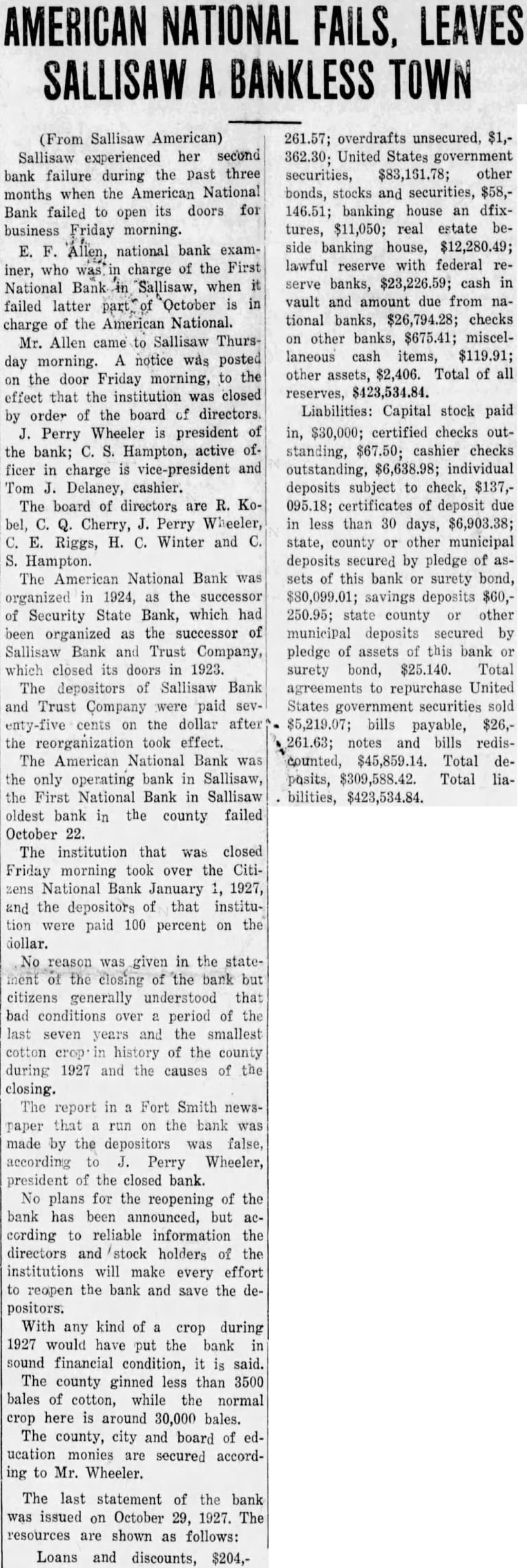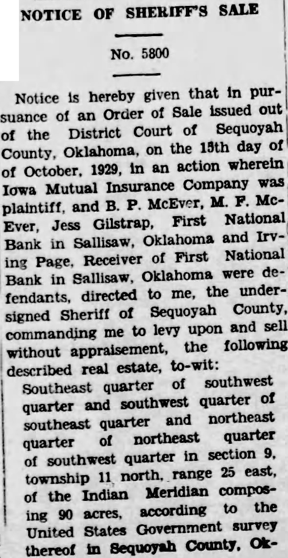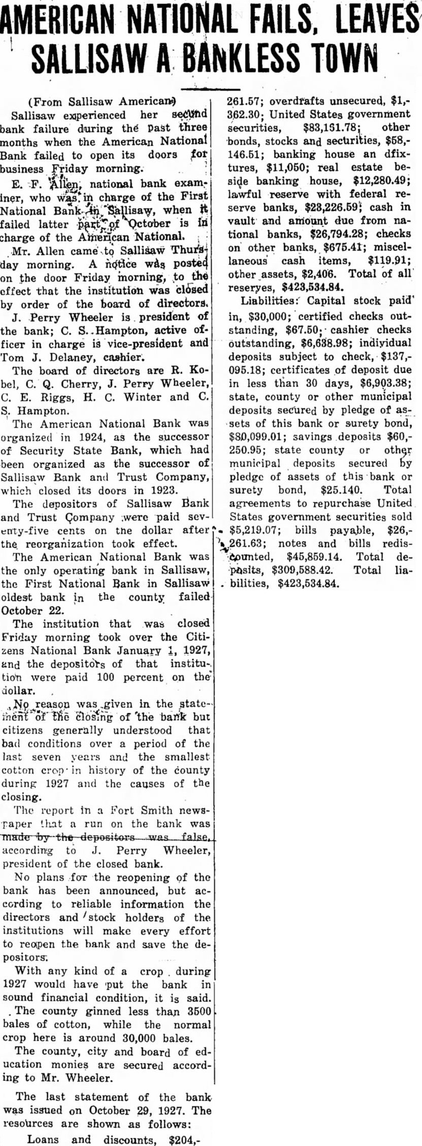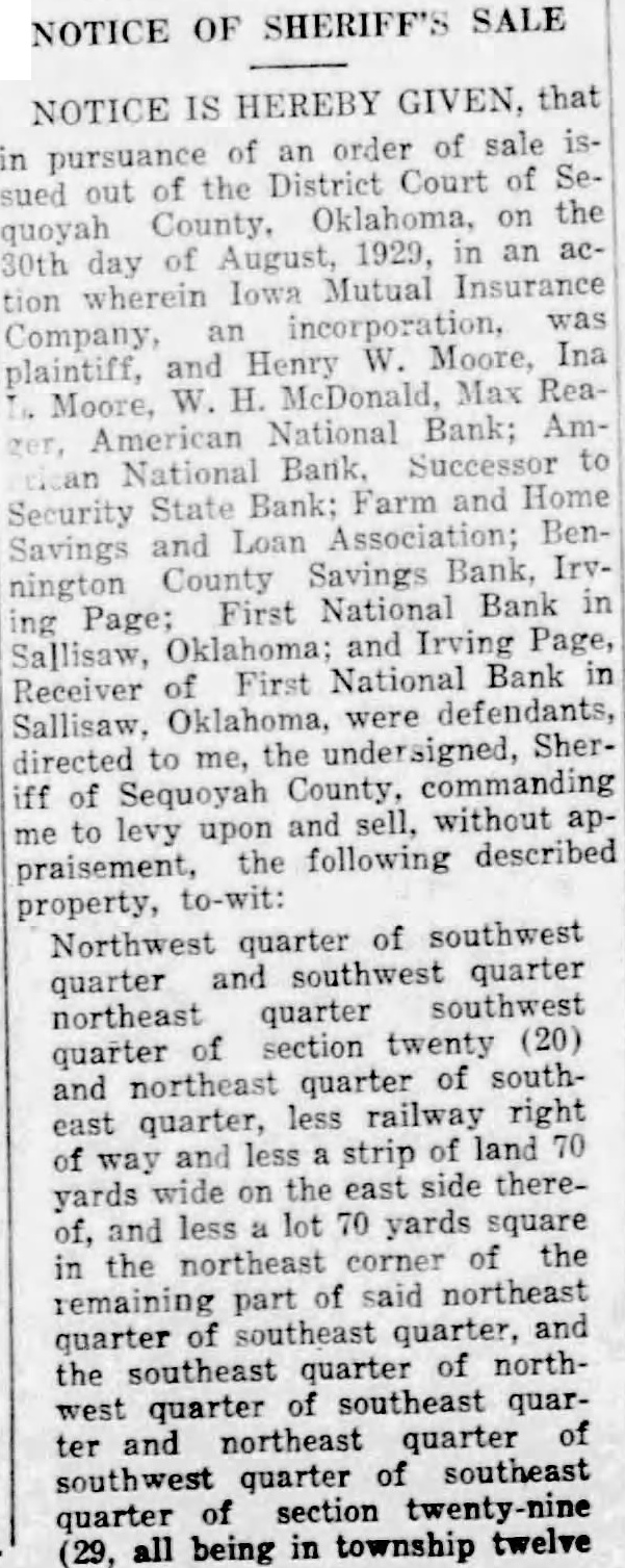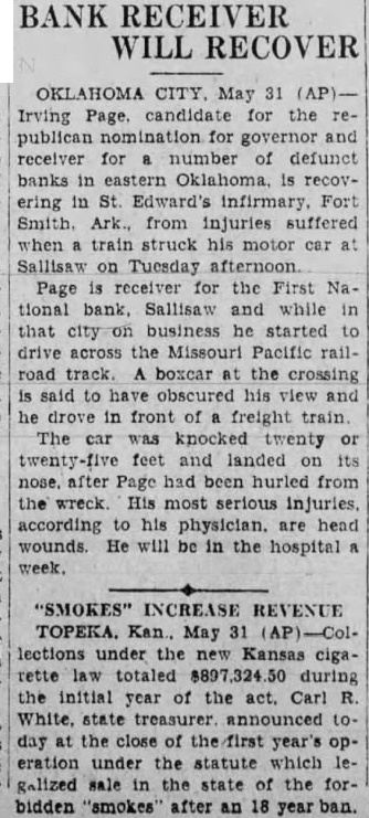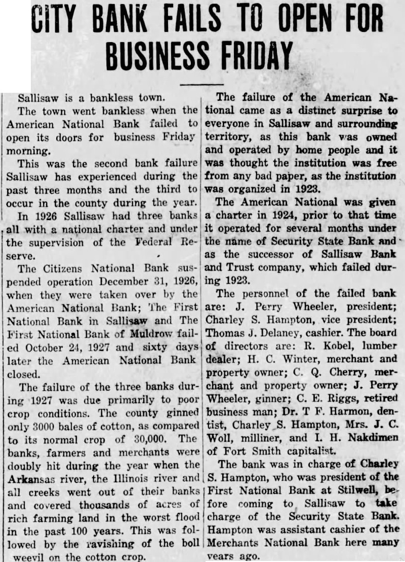 LOOKING OVER OKLAHOMA Labor Omnia Vincit HENRY COUPLE MARRIED 50 YEARS Oct. 27. Married 71. observed their golden wedding anniversary The here Tuesday quietly couple were married October 1877 at have the succeeded in staying out of debt all time and will be glad to live long as the Lord Mr said Clift When they came to Henryetta years as much as brick had been laid in the town. MAKE RECORD RUN TO GET FUNDS FOR BANK SALLISAW Oct. -When the First National bank of Sallisaw and the First National bank of Muldrow were both closed Monday by federal bank examiners. officers of the American National bank of Sallisaw dispatched Walter Hampton, motor dealer, and Ira Holder to Fort Smith to secure extra cash to withstand an expected run on the bank. The two men made the trip to Fort Smith and back of 54 miles, in minutes. and in this time must be included eight minutes spent in bank at Fort Smith. That is, the men rode faster than mile and minute But the money was not needed. No one withdrew dime PIONEER REFINERY TO BE SOLD AT AUCTION GUTHRIE Oct. Want to buy refinery? The Pioneer refinery mile north of Guthrie. will be sold at suction to the highest bidder November Frank Rinehart. chairman of the board of county commistoday The county secured the plant. which represents an of when delinquent taxes were not paid. ADA INTERESTED IN TULSA WEWOKA ROAD ADA. Oct. 27-Ada is watching with Interest being made on a new railway from Tulsa to Wewoka S. Hynds. secretary of the chamber of who accompanied the Tulsa Educational Special train: Ed Gwyn. O. E. Parker and W D.1 Little. members of the board of directors. have been working with interested men in Seminole and Wewoka. Hynds has been at work for several seeking to make Ada stop on the road. Orwig Wewoka, of the new railway company is optimistic that the commerc commission will grant the request for the new road DR. CLAXTON IN MUSKOGEE TODAY MUSKOGEE Oct. 27 Dr. Philander Claxton superintendent Tulsa schools and for eleven years United States commissioner of education, will deliver three addresses in Muskogee today. He will address the Men's Bible class of the Episcopal church. the Rotary club and the patrons of West High school. In company with C. K. Reiff. superintendent of schools, he will visit various city schools here. BANK FAILURE LEADS TO HUGOAN'S BANKRUPTCY HUGO. Oct 27.-To the failure of the Hugo National bank in May, 1925. is partly ascribed the bank ruptcy W. Webb, well known Hugo citizen and property owner. who filed petition in bankruptcy in federal court Muskogee listing liabilities at $359,793 and assets Liabilities consist principally of mortgages held by various banks and to which bank official, he affixed his signature. OKEMAH JUDGE IS HONORED BY BAR Oct 27. District Judge John L. Norman has been honored by the Oklahoma bar in being named secretary of the newly formed association of Oklahoma district and superior court judges Judge John B. Ogden of Ardmore is president and Judge Tom G. Chambers of Oklahoma City, vice president. WHAT THE CHURCHES SHOULD -WILLIAMS OKMULGEE Oct. What we need the money and the work of the churches, not for propaganda to bring congress to make more laws and more offenses, but to put men into office who will enforce the laws we already have," said federal Judge Robert Williams as he held federal The judge is former of Oklahoma. Continuing he said have sold many bottle of morphine for 50 cents back in the days when was not crime to do so, and am sorry for men who go to the penitentiary for the same things no