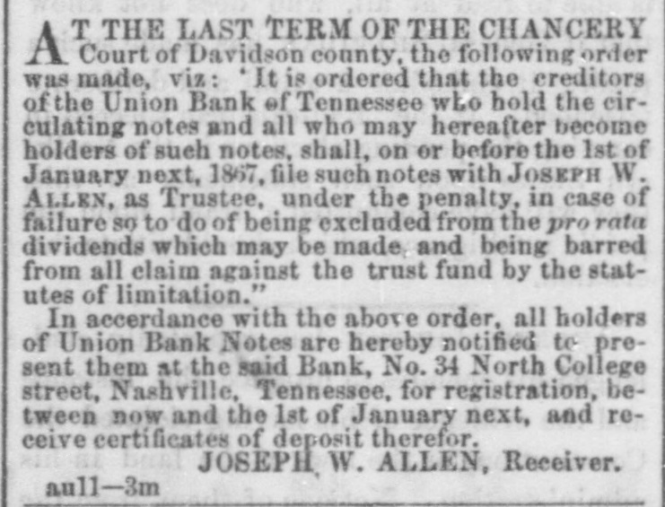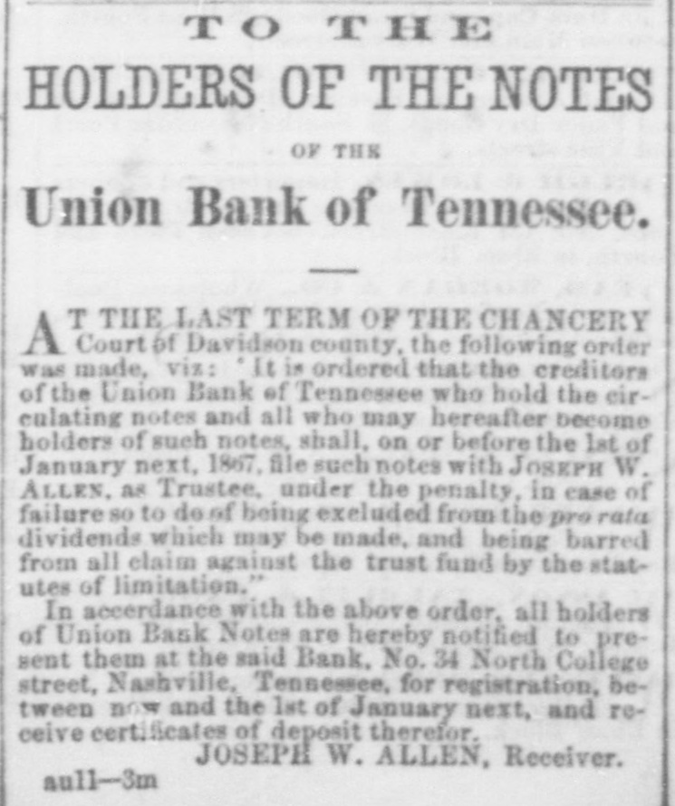 TO H E HOLDERS OF THE NOTES OF THE Union Bank of Tennessee. T THE LAST TERM OF THE CHANCERY A Court of Davidson county, the following order was made, viz: "It is ordered that the creditors of the Union Bank of Tennessee who hold the eireulating notes and all who may hereafter become holders of such notes, shall, on or before the 1st of January next. 1867. file such notes with JOSEPH W. ALLEN, as Trustee, under the penalty, in case of failure so to de of being excluded from the pro rata dividends which may be made, and being barred from all claim against the trust fund by the statutes of limitation." In accordance with the above order. all holders of Union Bank Notes are hereby notified to present them at the said Bank, No. 34 North College street, Nashville, Tennessee, for registration, between now and the 1st of January next, and receive certificates of deposit therefor. JOSEPH W. ALLEN, Receiver. aull-3m