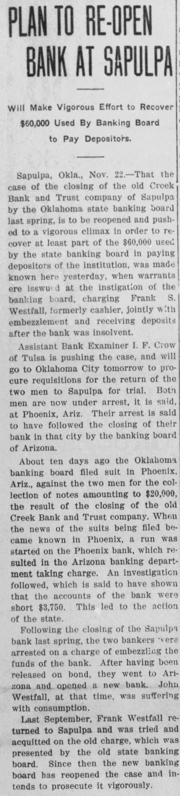 PLAN TO RE-OPEN BANK AT SAPULPA Will Make Vigorous Effort to Recover $60,000 Used By Banking Board to Pay Depositors. Sapulpa, Okla., Nov. 22.-That the case of the closing of the old Creek Bank and Trust company of Sapulpa by the Oklahoma state banking board last spring, is to be reopened and pushed to a vigorous climax in order to recover at least part of the $60,000 used by the state banking board in paying depositors of the institution, was made known here yesterday, when warrants ere isswued at the instigation of the banking board, charging Frank S. Westfall, formerly cashier, jointly with embezzlement and receiving deposits after the bank was insolvent. Assistant Bank Examiner I. F. Crow of Tulsa is pushing the case, and will go to Oklahoma City tomorrow to procure requisitions for the return of the two men to Sapulpa for trial. Both men are now under arrest, it is said, at Phoenix, Ariz. Their arrest is said to have followed the closing of their bank in that city by the banking board of Arizona. About ten days ago the Oklahoma banking board filed suit in Phoenix, Ariz., against the two men for the collection of notes amounting to $20,000, the result of the closing of the old Creek Bank and Trust company. When the news of the suits being filed became known in Phoenix, a run was started on the Phoenix bank, which resulted in the Arizona banking department taking charge. An investigation followed, which is said to have shown that the accounts of the bank were short $3,750. This led to the action of the state. Following the closing of the Sapulpa bank last spring, the two bankers vere arrested on a charge of embezzling the funds of the bank. After having been released on bond, they went to Arizona and opened a new bank. John Westfall, at that time, was suffering with consumption. Last September, Frank Westfall returned to Sapulpa and was tried and acquitted on the old charge, which was presented by the old state banking board. Since then the new banking board has reopened the case and intends to prosecute it vigorously.