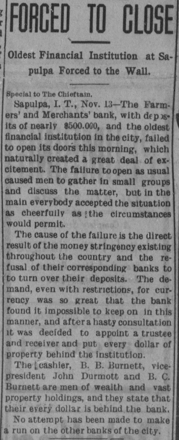 FORCED TO CLOSE Oldest Financial Institution at Sapulpa Forced to the Wall. Special to The Chieftain. Sapulpa, I. T., Nov. 13-The Farmers' and Merchants' bank, with depos its of nearly $500.000, and the oldest financial institution in the city, failed to open its doors this morning, which naturally created a great deal of excitement. The failure to open as usual caused men to gather in small groups and discuss the matter, but in the main everybody accepted the situation as cheerfully as the circumstances would permit. The cause of the failure is the direct result of the money stringency existing throughout the country and the refusal of their corresponding banks to to turn over their deposits. The demand, even with restrictions, for currency was so great that the bank found it impossible to keep on in this manner, and after a hasty consultation it was decided to appoint a trustee and receiver and put every dollar of property behind the institution. The cashier, B. B. Burnett, vicepresident John Durmott and B. C. Burnett are men of wealth and vast property holdings, and they state that their every dollar is behind the bank. No attempt has been made to make a run on the other banks of the city.