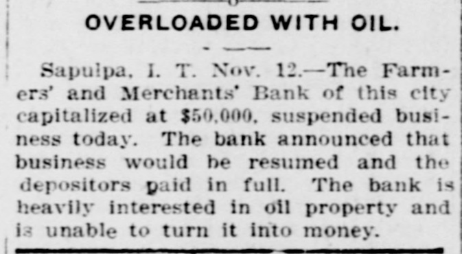 OVERLOADED WITH OIL. Sapulpa, I. T. Nov. 12.-The Farmers' and Merchants' Bank of this city capitalized at $50,000. suspended business today. The bank announced that business would be resumed and the depositors paid in full. The bank is heavily interested in oil property and is unable to turn it into money.