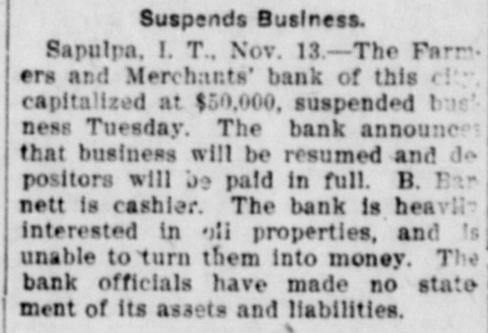 Bank (Sapulpa, I.T. — Indian Territory, later Oklahoma) suspended and a receiver/trustee was appointed on Nov 13, 1907. Cause cited is the national money stringency and refusal of correspondent banks to turn over funds; articles also note heavy investment in illiquid oil properties. No clear contemporaneous run on this bank is described. Capitalization reported as $50,000 in several items. OCR errors corrected (I. T. -> Indian Territory).