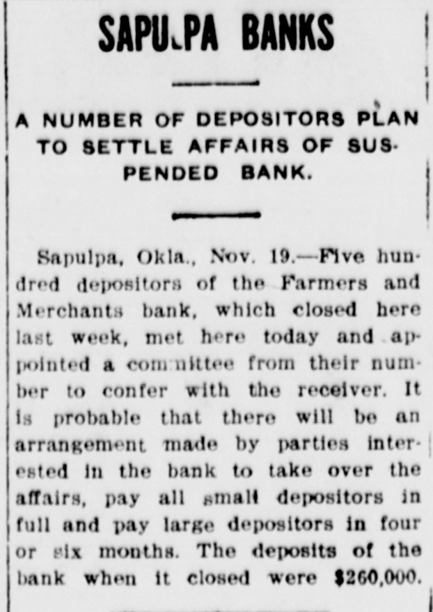 SAPULPA BANKS A NUMBER OF DEPOSITORS PLAN TO SETTLE AFFAIRS OF SUSPENDED BANK. Sapulpa, Okla., Nov. 19.-Five hundred depositors of the Farmers and Merchants bank, which closed here last week, met here today and appointed a committee from their number to confer with the receiver. It is probable that there will be an arrangement made by parties interested in the bank to take over the affairs, pay all small depositors in full and pay large depositors in four or six months. The deposits of the bank when it closed were $260,000.