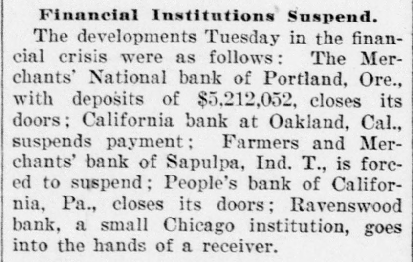 Financial Institutions Suspend. The developments Tuesday in the financial crisis were as follows: The Merchants' National bank of Portland, Ore., with deposits of $5,212,052, closes its doors; California bank at Oakland, Cal., suspends payment; Farmers and Merchants' bank of Sapulpa, Ind. T., is forced to suspend; People's bank of California, Pa., closes its doors; Ravenswood bank, a small Chicago institution, goes into the hands of a receiver.