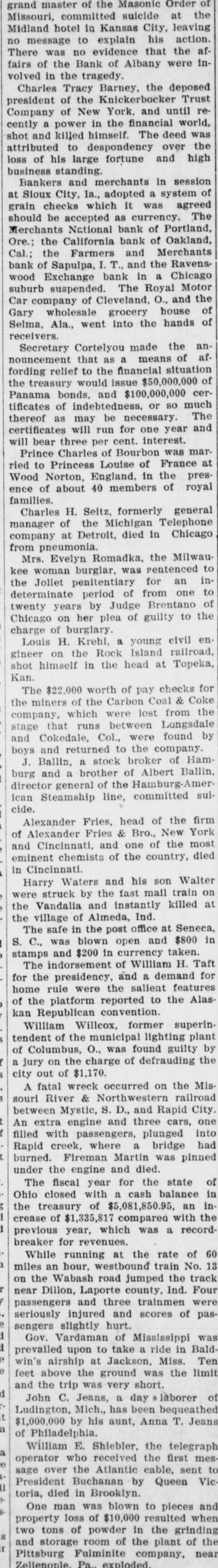 grand master of the Masonic Order Missouri, committed suicide at the Midland hotel in Kansas City, leaving no message to explain his action. There was no evidence that the fairs of the Bank of Albany were volved in the tragedy. Charles Tracy Barney, the deposed president of the Knickerbocker Trust Company of New York, and until cently a power in the financial world, shot and killed himself. The deed attributed to despondency over the loss of his large fortune and business standing. Bankers and merchants in session at Sioux City, Ia., adopted a system of grain checks which it was agreed should be accepted as currency. Merchants National bank of Portland Ore.; the California bank of Oakland Cal.; the Farmers and Merchants bank of Sapulpa, I. T., and the Ravens wood Exchange bank in a Chicago suburb suspended. The Royal Motor Car company of Cleveland, O., and the Gary wholesale grocery house Selma, Ala., went into the hands receivers. Secretary Cortelyou made the nouncement that as a means of fording relief to the financial situation the treasury would issue $50,000,000 Panama bonds, and $100,000,000 tificates of indebtedness, or so much thereof as may be necessary. The certificates will run for one year will bear three per cent. interest. Prince Charles of Bourbon was ried to Princess Louise of France Wood Norton, England, in the ence of about 40 members of families. Charles H. Seitz, formerly genera manager of the Michigan Telephone company at Detroit, died in Chicago from pneumonia. Mrs. Evelyn Romadka, the Milwau kee woman burglar, was sentenced the Joliet penitentiary for an determinate period of from one twenty years by Judge Brentano Chicago on her plea of guilty to charge of burglary. Louis H. Krehl, a young civil gineer on the Rock Island railroad shot himself in the head at Topeka Kan. The $22,000 worth of pay checks fo the miners of the Carbon Coal & company, which were lost from stage that runs between Longsdal and Cokedale, Col., were found boys and returned to the company. J. Ballin, a stock broker of Ham burg and a brother of Albert Ballin director general of the Hamburg-Amer ican Steamship line, committed cide. Alexander Fries, head of the of Alexander Fries & Bro., New Yor and Cincinnati, and one of the eminent chemists of the country, in Cincinnati. Harry Waters and his son Walte were struck by the fast mail train the Vandalia and instantly killed the village of Almeda, Ind. The safe in the post office at Seneca S. C., was blown open and $800 stamps and $200 in currency taken. The indorsement of William H. Taf for the presidency, and a demand home rule were the salient feature of the platform reported to the kan Republican convention. William Willcox, former superir tendent of the municipal lighting of Columbus, O., was found guilty a jury on the charge of defrauding city out of $1,170. A fatal wreck occurred on the souri River & Northwestern railroa between Mystic, S. D., and Rapid An extra engine and three cars, filled with passengers, plunged