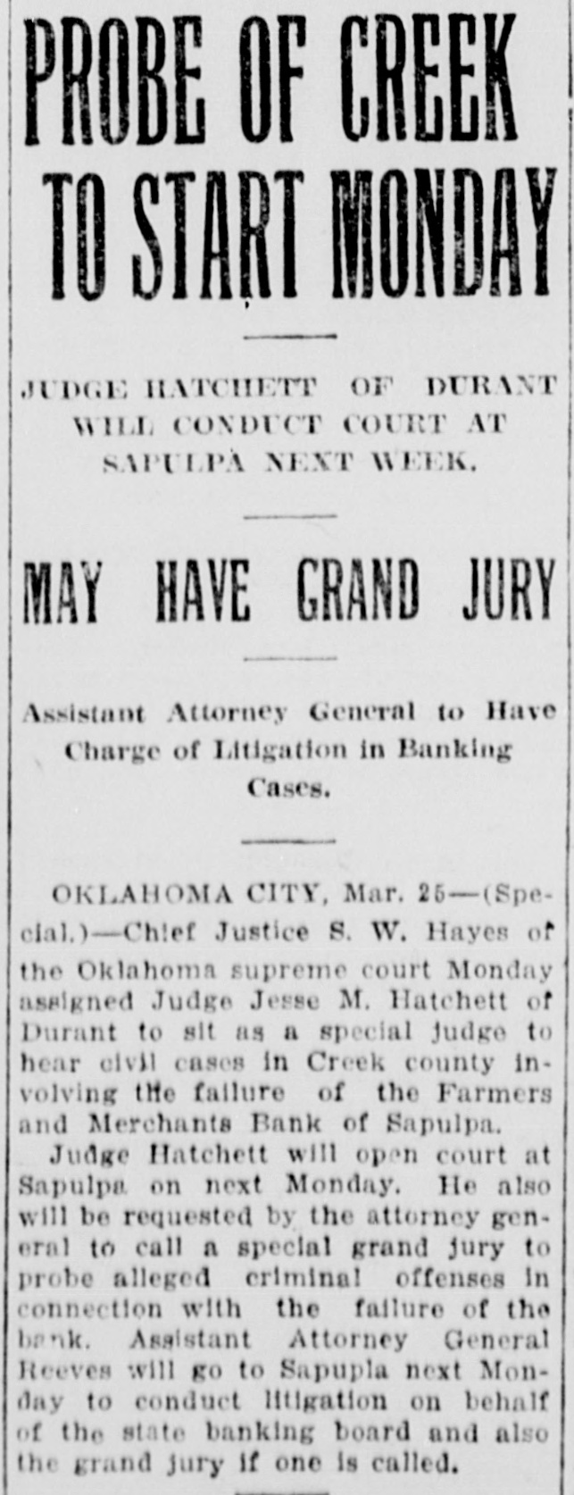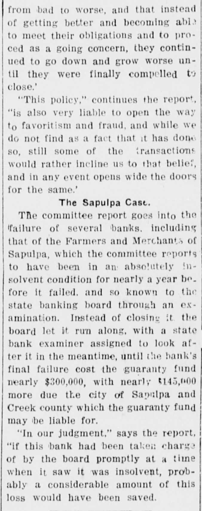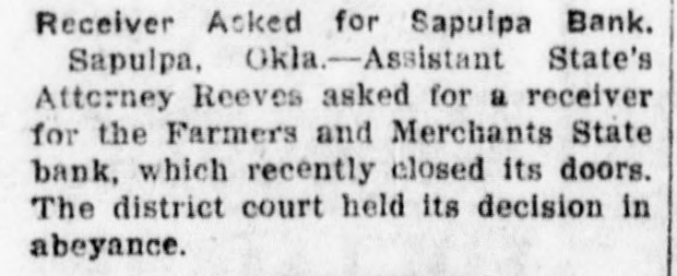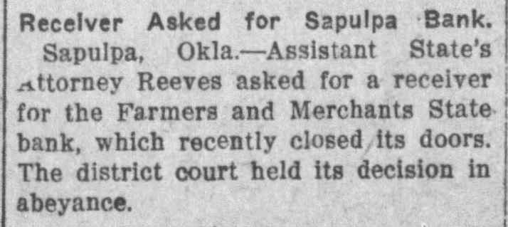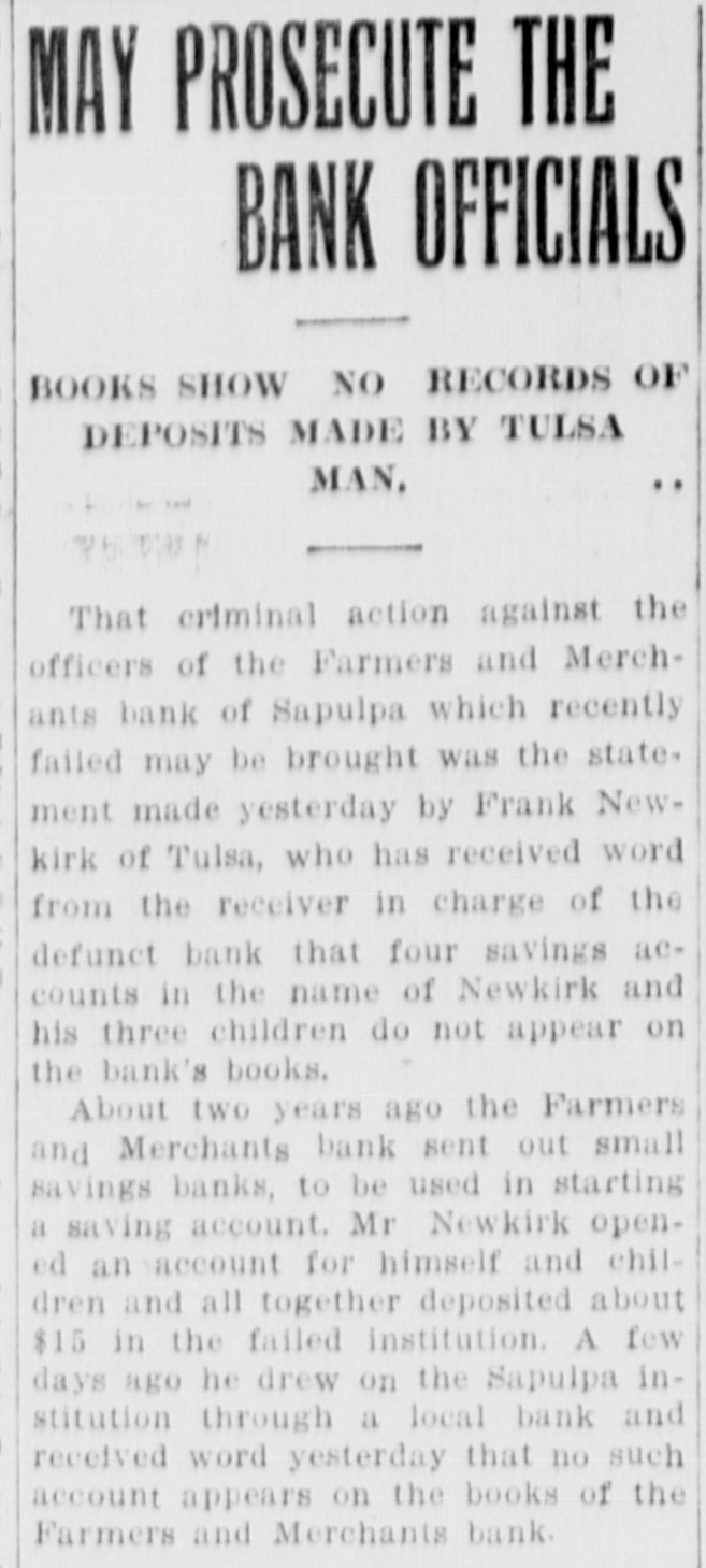 # MAY PROSECUTE THE BANK OFFICIALS BOOKS SHOW NO RECORDS OF DEPOSITS MADE BY TULSA MAN. That criminal action against the officers of the Farmers and Merchants bank of Sapulpa which recently failed may be brought was the statement made yesterday by Frank Newkirk of Tulsa, who has received word from the receiver in charge of the defunct bank that four savings accounts in the name of Newkirk and his three children do not appear on the bank's books. About two years ago the Farmers and Merchants bank sent out small savings banks, to be used in starting a saving account. Mr Newkirk opened an account for himself and children and all together deposited about $15 in the failed institution. A few days ago he drew on the Sapulpa institution through a local bank and received word yesterday that no such account appears on the books of the Farmers and Merchants bank.
