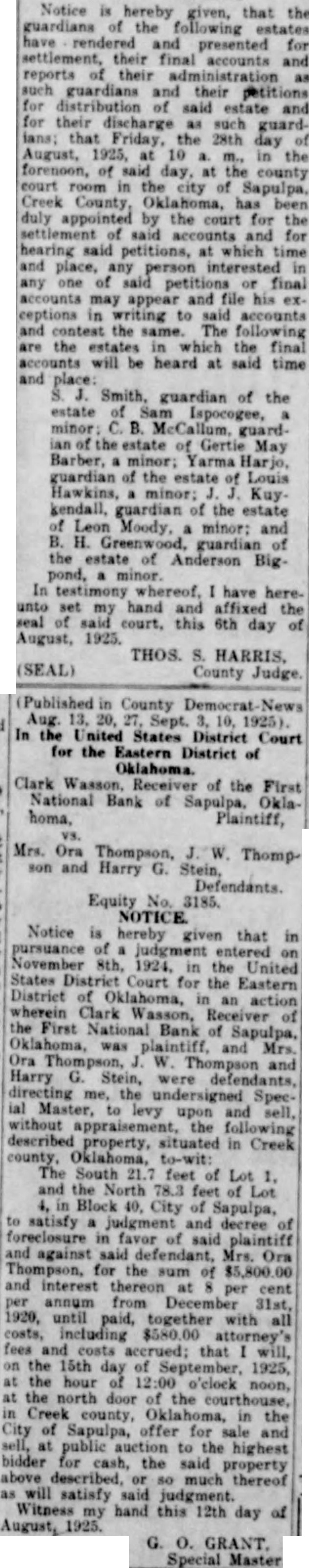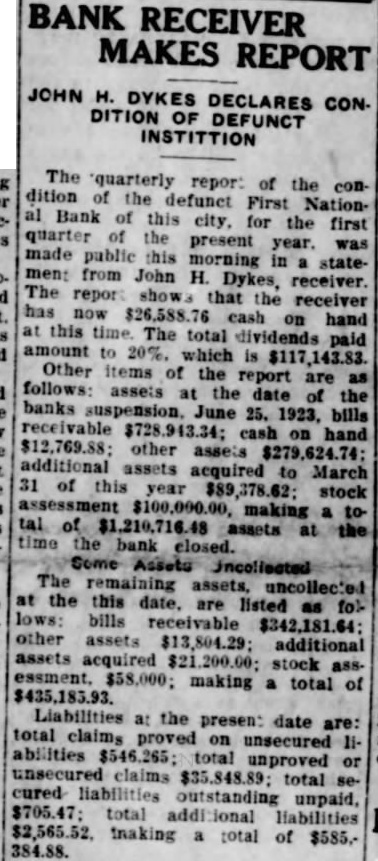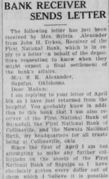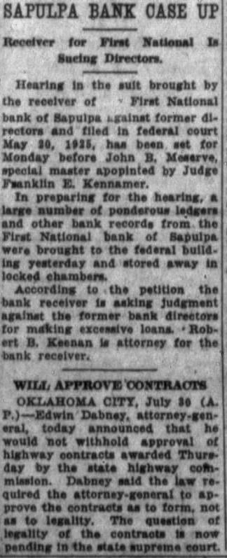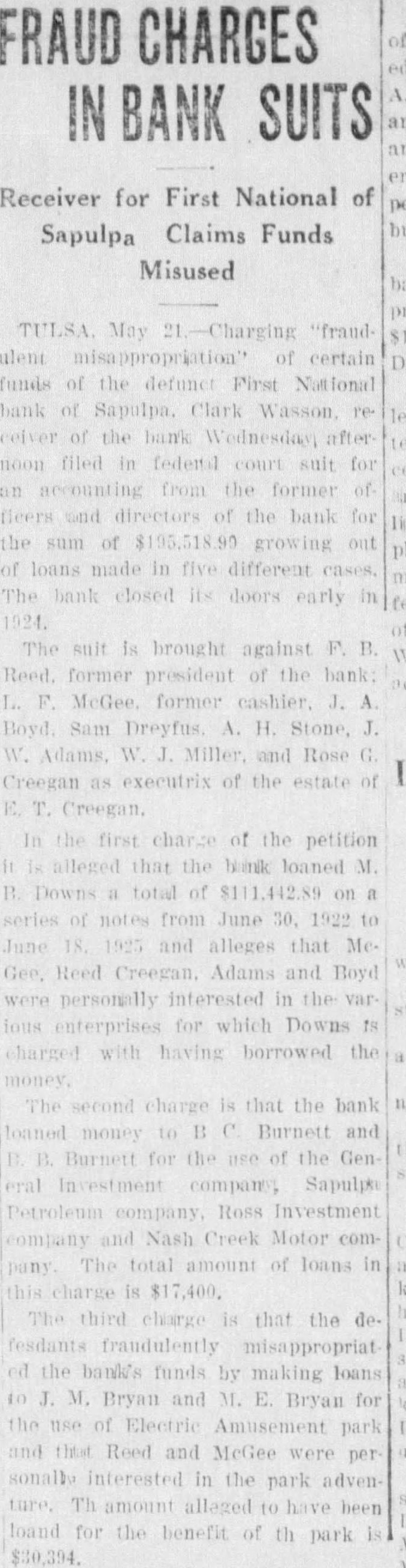 FRAUD CHARGES IN BANK SUITS Receiver for First National of Sapulpa Claims Funds Misused TULSA May 21.-Charging "fraudulent misappropriotion" of certain funds of the defuner First National celver of the bank Wednesday after noon filed in federal court suit for accounting from the former of fleers and directors of the bank for the sum of $195,518.90 growing out of loans made in five different cases. The bank closed its doors early in 1924. The suit is brought against F. B. Reed. former president of the bank: F. McGee former cashier. J. A Boyd. Sam Dreyfus A. H. Stone, J. W. Adams, W. Miller and Rose G. Creegan as executrix of the estate of In the first charge of the petition is alleged that the blank loaned M. B. Downs a total of $111,442.89 on a series of notes from June 30, 1922 to June 18. 1925 and alleges that MeGee. Reed Creegan. Adams and Boyd personally interested in the var ous enterprises for which Downs IS charged with having borrowed the money The second charge is that the bank loaned money to B C Burnett and B. Burnett for the use of the GenPetroleum company, Ross Investment company and Nash Creek Motor company. The total amount of loans in this charge is $17,400. The third charge is that the defesdants fraudulently misappropriat ed the bank's funds by making loans to J. M. Bryan and M. E. Bryan for the use of Electric Amusement park and that Reed and McGee were per sonally interested in the park adventure. Th amount alleged to have been loand for the benefit of th park