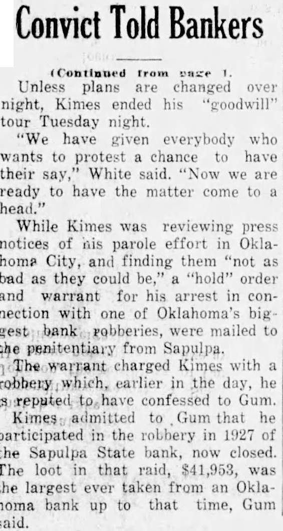 Convict Told Bankers (Continued from page Unless plans are changed over night, Kimes ended his "goodwill" tour Tuesday night. "We have given everybody who wants to protest chance to have their say,' White said. "Now we are ready to have the matter come to a head." While Kimes was reviewing press notices of nis parole effort in Oklahoma City, and finding them "not as bad as they could be," a "hold" order and warrant for his arrest in connection with one of Oklahoma's big. gest bank robberies, were mailed to the penitentiary from Sapulpa. The warrant charged Kimes with a robbery which, earlier in the day, he is reputed to have confessed to Gum. Kimes: admitted to Gum that he participated in the robbery in 1927 of the Sapulpa State bank, now closed. The loot in that raid, $41,953, was the largest ever taken from an Oklahoma bank up to that time, Gum said.
