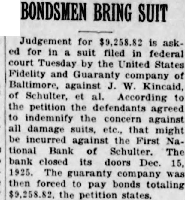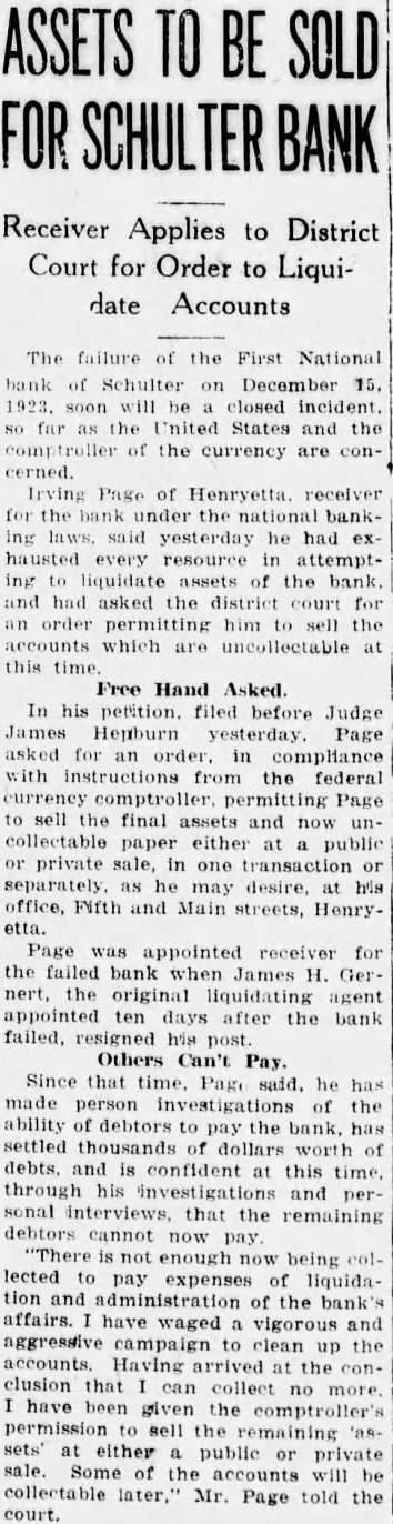 The failure of the First National bank of Schulter on December 15. 1923. soon closed incident. far as the United States and the of the currency are concerned. Irving Page of Henryetta. receiver for the bank under the national bankIng laws. said yesterday he had ex hausted every resource in attempting to liquidate assets of the bank. and had asked the district court for an order permitting him sell the accounts which are uncollectable at this time