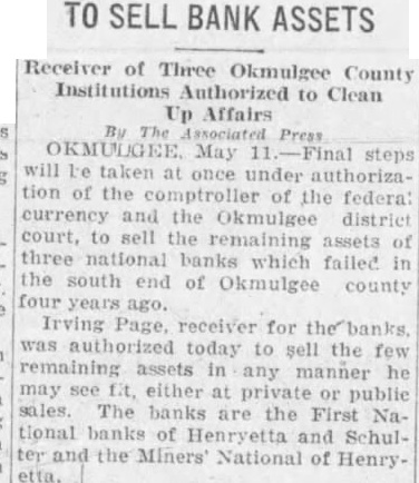 Free Hand Asked In his petition. filed before Judge James Hepburn yesterday Page asked for an in compliance with instructions from the federal comptroller permitting Page to sell the final assets and now uncollectable paper either a public or private sale, in one transaction or separately. as he may desire, at his office, Fifth and Main streets, Henryetta. Page was appointed receiver for the failed bank when James H. Ger. nert, the original liquidating agent appointed ten days after the bank failed, resigned his post. Others Can't Pay. Since that time, Page said, he has made investigations of the ability of debtors to pay the bank, has settled thousands of dollars worth of debts. and is confident at this time through his and personal interviews, that the remaining debtors cannot now pay "There not enough now being lected to pay expenses of liquida tion and administration of the bank's affairs. have waged vigorous and aggressive campaign to clean up the accounts. Having arrived at the conclusion that can collect no more have been given the comptroller's permission to sell the remaining sets' at either public or private Some of the accounts will collectable later," Mr. Page told the