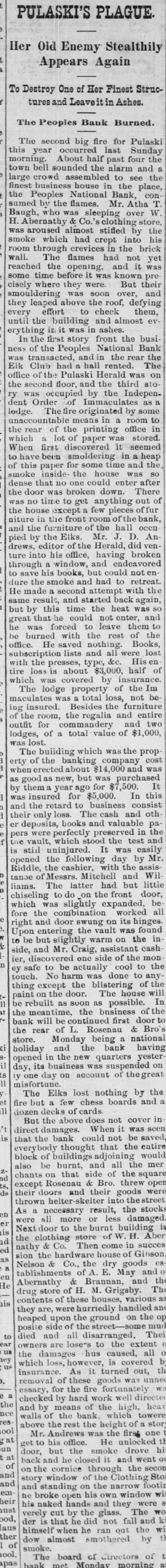 PULASKI'S PLAGUE. Her Old Enemy Stealthily Appears Again To Destroy One of Her Finest Structures and Leaveit in Ashes. The Peoples Bauk Burned. The second big fire for Pulaski this year occurred last Sunday morning. About half past four the town bell sounded the alarm and large crowd assembled to see the finest business house in the place, the Peoples National Bank con sumed by the flames. Mr. Atha Baugh. who was sleeping over W H. Abernathy & Co. clothing store was aroused almost stifled by the smoke which had crept into his room through crevices in the brick wall. The flames had not yet reached the opening, and it some time before it was known pre cisely where they were. But their smouldering was soon over, and they leaped above the roof, defying every effort to check them. until the building and almost erything in it was in ashes In the first story front the busi ness of the Peoples National Bank was transacted, and in the rear the Elk Club had hall rented. The office of the Pulaski Herald was on the second floor. and the third sto ry was occupied by the Independent Order of Immaculates lodge. The fire originated by some unaccountable means in a room to the rear of the printing office which a lot of paper was stored When first discovered it seemed to have been smoldering in heap of this paper for some time and the smoke inside the house was so dense that no one could enter after the door was broken down. There was no time to get anything out of the house except few pieces of fur niture in the front room of the bank, and the furniture of the ha occu pied by the Elks. Mr. J. D. An drews, editor of the Herald. did ven ture into his office, having broken through window, and endeavored to save his books, but could not dure the smoke and had to retreat He made second attemp with the same result, and started back again but by this time the heat was great that he could not enter, and he was forced to leave them be burned with the rest of the office. He saved nothing. Books, subscription lists and all were with the presses, type, &c. His tire loss about $3,000, half of which was covered by insurance The lodge property of the Im maculates was total loss, not being insured. Besides the furniture of the room, the regalia and entire outfit for commandery and two lodges, of a total value of $1,000, was lost The building which was the prop erty of the banking company cost when erected about $14,000 and was as good as new, but was purchased It by them a year ago for $7,500. was insured for $5,000. In this and the retard to business consist their only loss. The cash and oth er deposits, books and valuable papers were perfectly preserved in the the vault. which stood the test is still uninjured. It was easily opened the following day by Mr Riddle the cashier, with the assistange of Messrs. Mitchell and Wil liams. The latter had but little chiseling to do on the front door which was slightly expanded, be fore the combination worked right and door swung on its hinges Upon entering the vault was found to be but slightly warm on the in side, and Mr Craig, assistant cash ier, discovered one side of the mon ey safe to be actually cool to the touch. No harm was done to any thing except the blistering of the paint on the door. The house In be rebuilt as soon as possible. the meantime, the business of the bank will be continued first door the rear of L. Rosenar & Bro's store. Monday being a national holiday and the bank having opened in the new quarters yester day, its business was suspended on iy one day on account of the great misfortune. The Elks lost nothing by the fire but a few chess boards and dozen decks of cards But the above does not cover in direct damages. When it was that the bank could not be everybody thought that the entire block of buildings adjoining would also be burnt. and all the mer chants on that side of the square except Rosenau & Bro. threw open their doors and their goods thrown helter skelter into the street As a necessary result, the stocks were all more or less damaged Next door to the burnt building d the clothing store of W H. Aber nathy & Co. Then come in succes sion the hardware house of Gibson Nelson & Co., the dry goods and tablishments of A E. May He Abernathy & Brannan, and drug store of H. M. Grigsby contents of these houses, various they are, were hurriedly handled heaped upon the ground on the posite side of the street some to died and all disarranged. The owners are losers to the extent us the damages hus caused, all us which however, is covered insurance, As it turned out, removal of these goods essary, for the fire fortunately checked by hard work the and by means of the high, walls of the bank which tool above the rest the height of at Mr. Andrews was the first un get to his office. He unlocked at door, but the smoke drove of back he closed it and went and on the cornice through the and story window of the Clothing em and standing on the narrow footi heir he broke open his own window ust naked hands and they were od, verely cut by the glass. The aus der that he did not fall and then himself when he ran out the of smoke dow almost smothered by tool, The board of Cirectors bank met Monday morning of