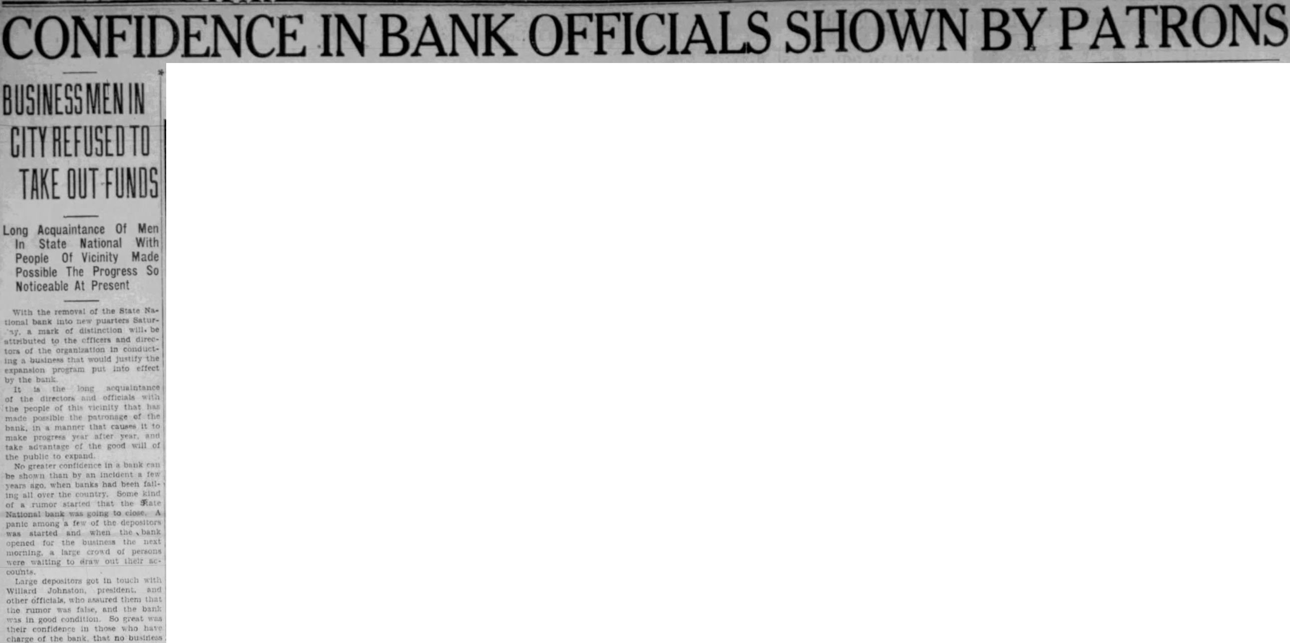 CONFIDENCE IN BANK OFFICIALS SHOWN BY PATRONS TAKE OUT FUNDS Long Acquaintance Of Men In State National With People Of Vicinity Made Possible The Progress So Noticeable At Present the removal of the State Na. bank into puarters Saturtional mark of distinction will. be attributed the officers and directo of the organization in conductthat would justify the ing business put into effect expansion program by the bank It the long acquaintance of the directors and officials with of this vicinity that has the people possible the patronage of the in manner that causes it to after year and make progress advantage of the good will of take the to No confidence in bank can shown than by few banks been all country. Some kind ing over of that the State National bank to among few of depositors panic started and bank was for the business the next large crowd of persons to Large depositors got in other who assured them that the rumor was false, and the bank in good So great their confidence in those who have charge of the bank that no business