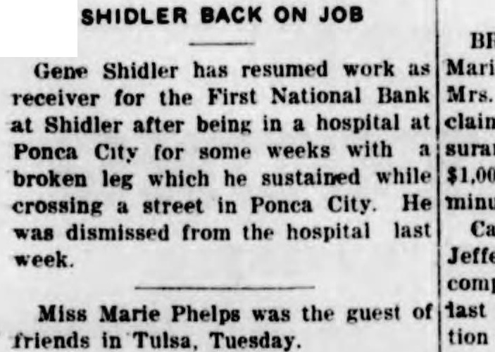 SHIDLER BACK JOB Gene Shidler has resumed work Marion receiver for the First National Bank Shidler after being in hospital claims Ponca City for weeks with broken leg which he sustained while crossing street in Ponca City. dismissed from the hospital last Carl week. Miss Marie Phelps was the guest friends Tuesday.