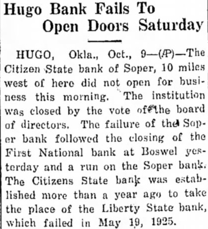 HUGO, Okla., Oct., 9-(.P)-The Citizen State bank of Soper, 10 miles west of here did not open for business this morning. The institution was closed by the vote of the board of directors. The failure of the Soper bank followed the closing of the First National bank at Boswel yesterday and a run on the Soper bank. The Citizens State bank was established more than a year ago to take the place of the Liberty State bank, which failed in May 19, 1925.