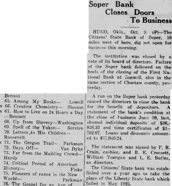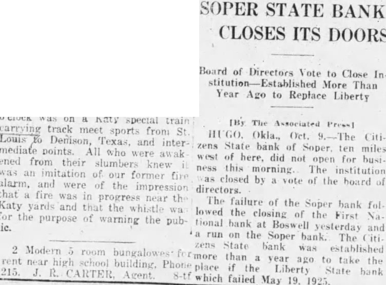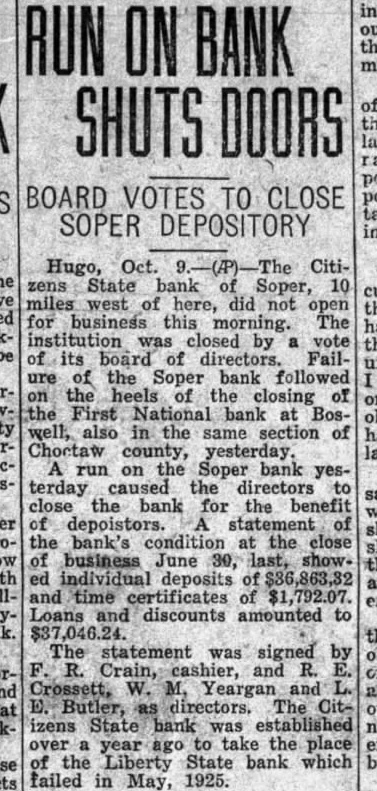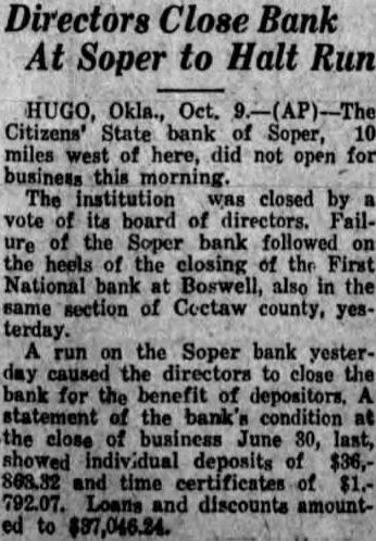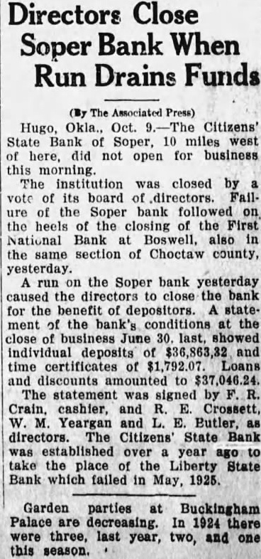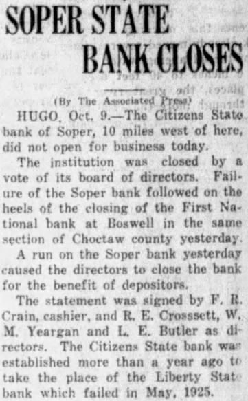 Hugo, Oct. Citizens State bank Soper, miles west here, did business this morning. institution closed by board directors. Failthe Soper bank followed closing First National bank at same section Choctaw county, yesterday. run on the Soper bank terday caused the directors the bank for the benefit depoistors. bank's the business June last, deposits time certificates Loans discounts amounted The statement signed Crossett, W. and Butler, The izens State take the place the Liberty State bank which failed in May, 1925.
