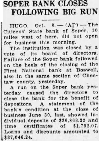 A run on the Soper bank yesterday caused the directors to close the bank for the benefit of depositors. A statement of the bank's condition at the close of business June 30, last, showed individual deposits of $36,836.32 and time certificates of $1.792.07. Loans and discounts amounted to $37,046.24.