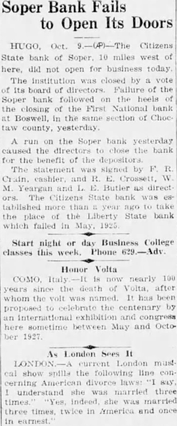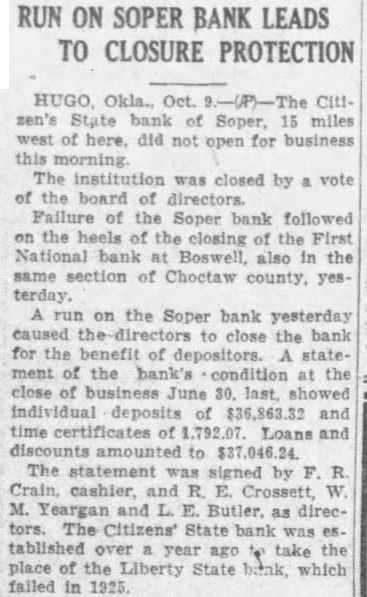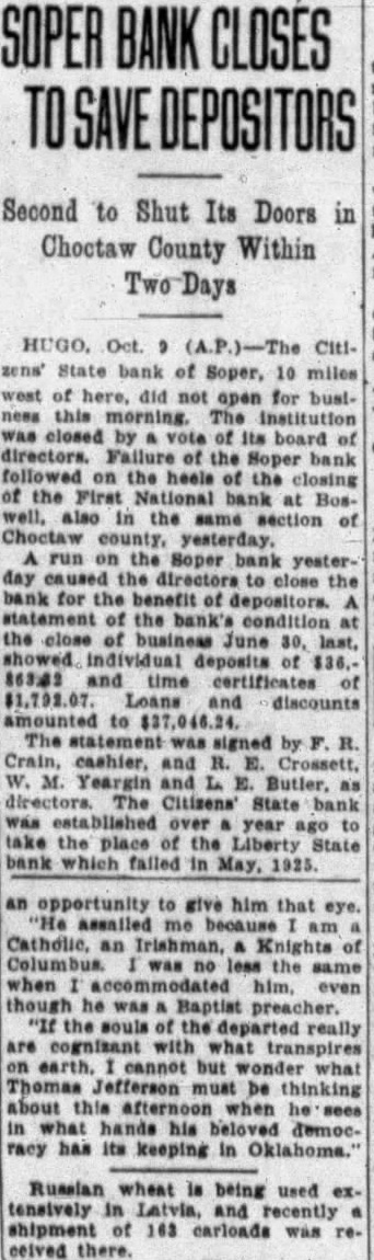 HUGO. Oct. 9 (A.P.)-The Citizens' State bank of Soper, 10 miles west of here, did not open for bustness this morning. The Institution was closed by a vote of its board of directors. Failure of the Soper bank followed on the heels of the closing of the First National bank at Boswell, also in the same section of Choctaw county, yesterday. A run on the Soper bank yesterday caused the directors to close the bank for the benefit of depositors. A statement of the bank's condition at the close of business June 30, last, showed individual deposits of $36.863.82 and time certificates of $1,792.07. Loans and discounts amounted to $37,046.24. The statement was signed by F. R. Crain, cashier, and R. E. Crossett, W. M. Yeargin and L. E. Butler, as directors. The Citizens' State bank was established over a year ago to take the place of the Liberty State bank which failed in May, 1925. an opportunity to give him that eye. "He assailed me because am Catholic, an Irishman, a Knights of Columbus. I was no less the same when I accommodated him, even though he was a Baptist preacher. "If the souls of the departed really are cognisant with what transpires on earth. cannot but wonder what Thomas Jefferson must be thinking about this afternoon when he sees in what hands his beloved democracy has its keeping in Oklahoma."