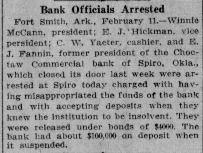 Pleading guilty to a charge of accepting deposits when he knew the bank was insolvent, C. W. Yeager, former cashier of the Choctaw Commercial bank which failed at Spiro, Okla., February 4, last, was fined $500 and costs in the district court at Poteau.
