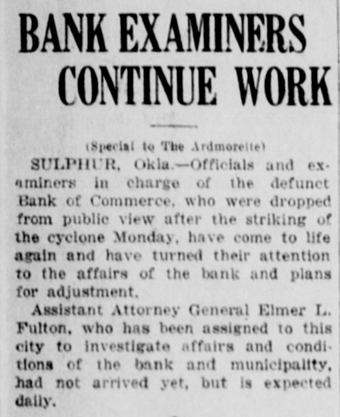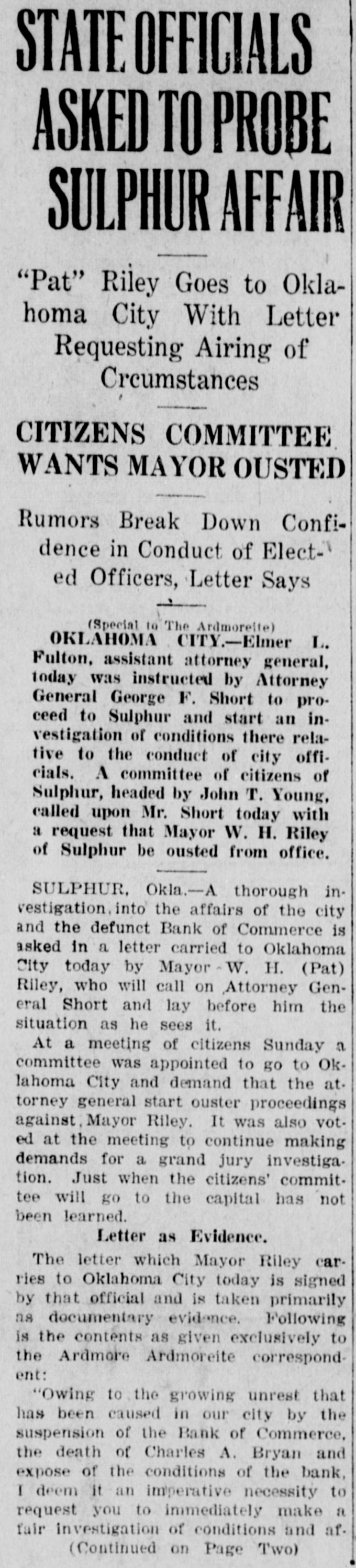BANK EXAMINER MAY PROBE INTO SULPHUR AFFAIR Others Implicated in Closing of Bank of Commerce Following Suicide of Charles Bryan DISCREPANCIES OF BOOKS ARE ALLEGED Dead Man Faced Embezzlement Charges in Regard to Bond Transaction (Special to The Ardmoreite) SULPHUR, Okla.-That other parties will be implicated in the closing of the Bank of Commerce was intimated by officials of that institution Wednesday morning, following the finding of the dead body of Charles Bryan, president of the bank, in a barn at his home Tuesday afternoon. A coroner's jury returned a verdict of death from gunshot wound, selfinflicted. Bryan died at a hospital a short time after he was found. He was unable to make a statement, but it is generally believed that he could not bear the face of the criticism that has been directed at him and other officials of the bank. Hints of Discrepancies. It is also intimated in various sources that when the books are audited that discrepancies, resulting from handling of city bonds, will be found, since this bank was holding the majority of the bonds recently voted for civic improvement. Several oil companies carried large accounts at the bank, and it is said that one company has had to shut down pending settlement of affairs of the bank. Early this week it was announced that the bank failed to open on February 23 because of "pernicious street rumors" that had caused depositors to n withdraw their accounts. It was said then that the books were being held it pending arrival of examiners to pass on them. Bryan Faced Arrest. According to Chief of Police Charles Vernon, Bryan's body was found by Sheriff Henry Parks, who had ad11 vised Bryan that he held a warrant ir for his arrest charging embezzlement. Bryan is said to have told the sheriff he would surrender to him after the 8 noon hour. but when he failed to keep e his appointment the sheriff started to investigate. o When the sheriff found Bryan's body in the barn in the rear of his is home there was a bullet hole in the h head over the right eye. A revolver 1. was lying nearby. 8 It is understood that the state bank : examiner will be asked to conduct a 8. thorough investigation into affairs of h the institution. S
