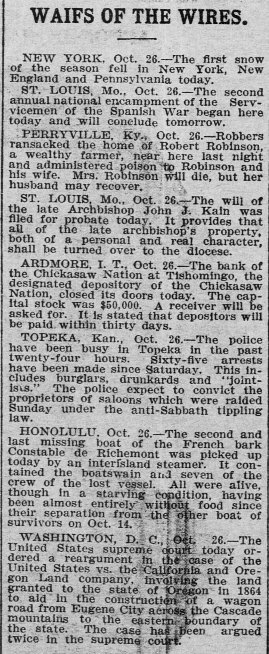 WAIFS OF THE WIRES. NEW YORK, Oct. 26.-The first snow of the season fell in New York, New England and Pennsylvania today. ST. LOUIS, Mo., Oct. 26.-The second annual national encampment of the Servvicemen of the Spanish War began here today and will conclude tomorrow. PERRYVILLE, Ky., Oct. 26.-Robbers ransacked the home of Robert Robinson, a wealthy farmer, near here last night and administered poison to Robinson and his wife. Mrs. Robinson will die, but her husband may recover. ST. LOUIS, Mo., Oct. 26.-The will of the late Archbishop John J. Kain was filed for probate today. It provides that all of the late archbishop's property, both of a personal and real character, shall be turned over to the diocese. ARDMORE, I. T., Oct. 26.-The bank of the Chickasaw Nation at Tishomingo, the designated depository of the Chickasaw Nation, closed its doors today. The capital stock was $50,000. A receiver will be asked for. It is stated that depositors will be paid within thirty days. TOPEKA, Kan., Oct. 26.-The police have been busy in Topeka in the past twenty-four hours. Sixty-five arrests have been made since Saturday. This includes burglars, drunkards and "jointists." The police expect to convict the proprietors of saloons which were raided law. Sunday under the anti-Sabbath tippling HONOLULU, Oct. 26.-The second and last missing boat of the French bark Constable de Richemont was picked up today by an interisland steamer. It contained the boatswain and seven of the crew of the lost vessel. All were alive, though in a starving condition, having been almost entirely without food since their separation from the other boat of survivors on Oct. 14. WASHINGTON, D. C., Oct. 26.-The United States supreme court today ordered a reargument in the case of the United States vs. the California and Oregon Land company, involving the land granted to the state of Oregon in 1864 to aid in the construction of a wagon road from Eugene City across the Cascade mountains to the eastern boundary of the state. The case has been argued twice in the supreme court.