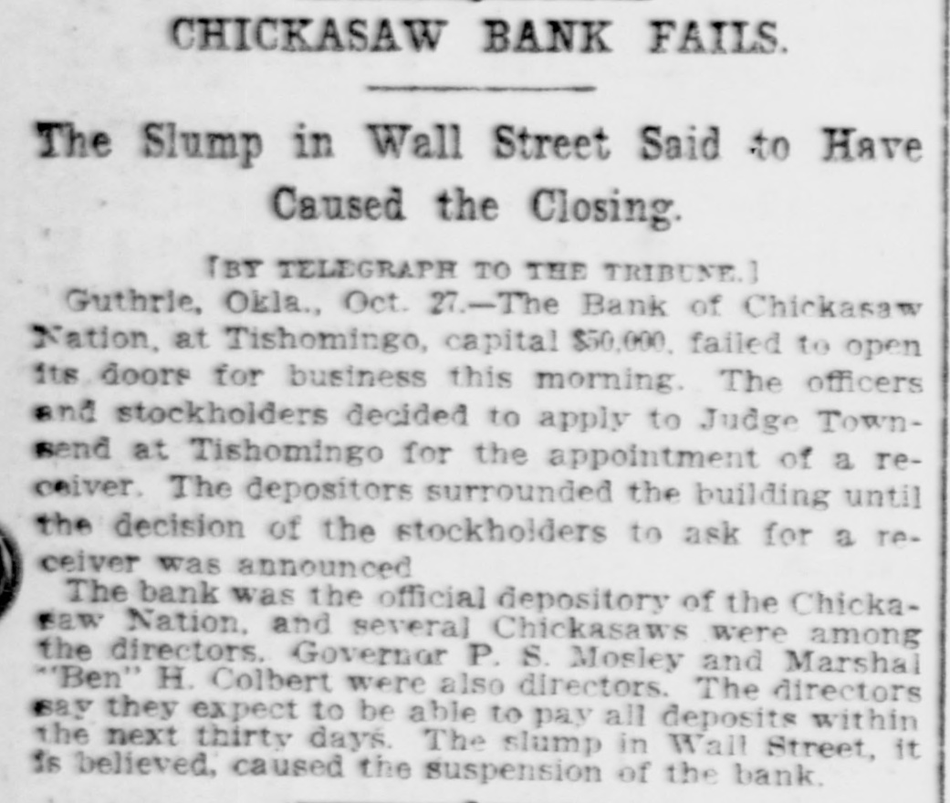 CHICKASAW BANK FAILS. The Slump in Wall Street Said to Have Caused the Closing. IBT TELEGRAPH TO THE TRIBUNE.) Guthrie, Okla., Oct. 27.-The Bank of Chickasaw Nation, at Tishomingo, capital $50,000. failed to open its doors for business this morning. The officers and stockholders decided to apply to Judge Townsend at Tishomingo for the appointment of a receiver. The depositors surrounded the building until the decision of the stockholders to ask for a Teceiver was announced The bank was the official depository of the Chickasaw Nation. and several Chickasaws were among the directors. Governor P. S. Mosley and Marshal "Ben" H. Colbert were also directors. The directors say they expect to be able to pay all deposits within the next thirty days. The slump in Wall Street, it is believed, caused the suspension of the bank.