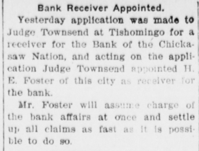 Bank Receiver Appointed. Yesterday application was made to Judge Townsend at Tishomingo for a receiver for the Bank of the Chickasaw Nation, and acting on the application Judge Townsend appointed H. E. Foster of this city as receiver for the bank. Mr. Foster will assume charge of the bank affairs at once and settle up all claims as fast as It is possible to do so.