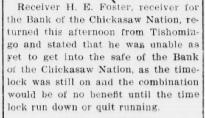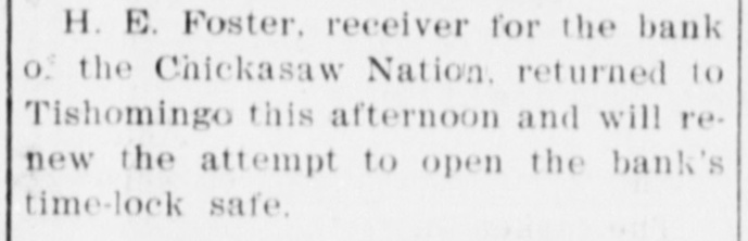 Receiver H. E. Foster, receiver for the Bank of the Chickasaw Nation, returned this afternoon from Tishomingo and stated that he was unable as yet to get into the safe of the Bank or the Chickasaw Nation, as the timelock was still on and the combination would be of no benefit until the time lock run down or quit running.