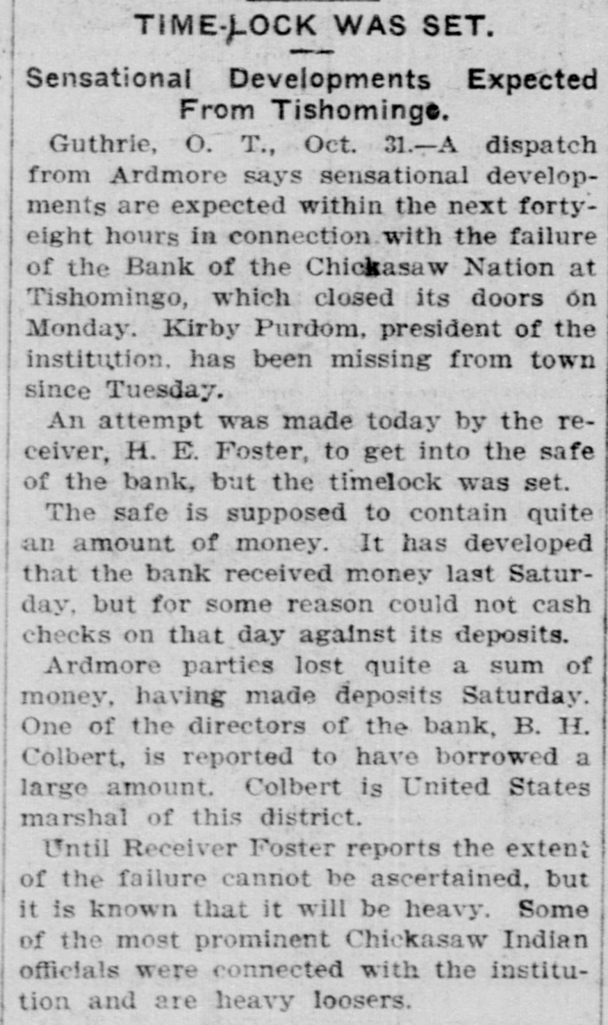 TIME-LOCK WAS SET. I Sensational Developments Expected From Tishominge. Guthrie, O. T., Oct. 31.-A dispatch from Ardmore says sensational developments are expected within the next fortyeight hours in connection with the failure of the Bank of the Chickasaw Nation at Tishomingo, which closed its doors on Monday. Kirby Purdom, president of the institution. has been missing from town since Tuesday. An attempt was made today by the receiver, H. E. Foster, to get into the safe of the bank, but the timelock was set. The safe is supposed to contain quite an amount of money. It has developed that the bank received money last Saturday, but for some reason could not cash checks on that day against its deposits. Ardmore parties lost quite a sum of money, having made deposits Saturday. One of the directors of the bank, B. H. Colbert, is reported to have borrowed a large amount. Colbert is United States marshal of this district. Until Receiver Foster reports the extent of the failure cannot be ascertained, but it is known that it will be heavy. Some of the most prominent Chickasaw Indian officials were connected with the institution and are heavy loosers.