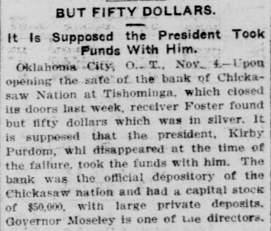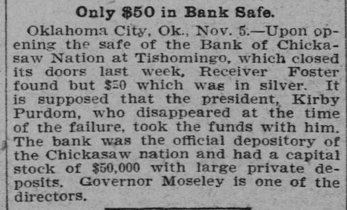 Only $50 in Bank Safe. Oklahoma City, Ok., Nov. 5.-Upon opening the safe of the Bank of Chickasaw Nation at Tishomingo, which closed its doors last week, Receiver Foster found but $50 which was in silver. It is supposed that the president, Kirby Purdom, who disappeared at the time of the failure, took the funds with him. The bank was the official depository of the Chickasaw nation and had a capital stock of $50,000 with large private deposits. Governor Moseley is one of the directors.