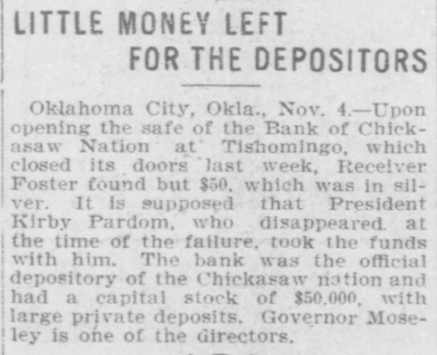 LITTLE MONEY LEFT FOR THE DEPOSITORS Oklahoma City, Okla., Nov. 4.-Upon opening the safe of the Bank of Chickasaw Nation at Tishomingo, which closed its doors last week, Receiver Foster found but $50, which was in silver. It is supposed that President Kirby Pardom, who disappeared. at the time of the failure, took the funds with him. The bank was the official depository of the Chickasaw nation and had a capital stock of $50,000, with large private deposits. Governor Moseley is one of the directors.