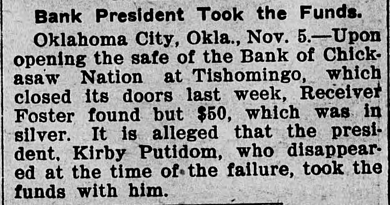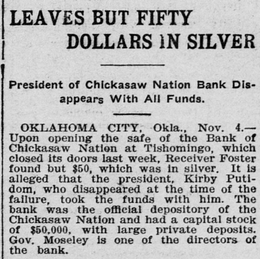 LEAVES BUT FIFTY DOLLARS IN SILVER President of Chickasaw Nation Bank Disappears With All Funds. OKLAHOMA CITY, Okla., Nov. 4.Upon opening the safe of the Bank of Chickasaw Nation at Tishomingo, which closed its doors last week, Receiver Foster found but $50, which was in silver. It is alleged that the president, Kirby Putidom, who disappeared at the time of the failure, took the funds with him. The bank was the official depository of the Chickasaw Nation and had a capital stock of $50,000, with large private deposits. Gov. Moseley is one of the directors of the bank.