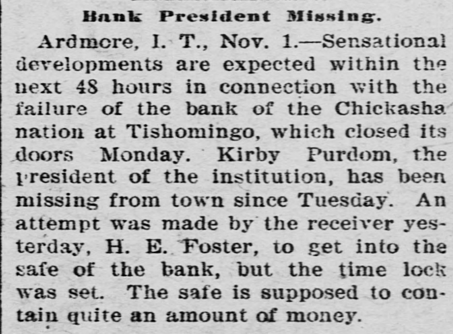 Bank President Missing. Ardmore, I. T., Nov. 1.-Sensational developments are expected within the next 48 hours in connection with the failure of the bank of the Chickasha nation at Tishomingo, which closed its doors Monday. Kirby Purdom, the president of the institution, has been missing from town since Tuesday. An attempt was made by the receiver yesterday, H. E. Foster, to get into the safe of the bank, but the time lock was set. The safe is supposed to contain quite an amount of money.