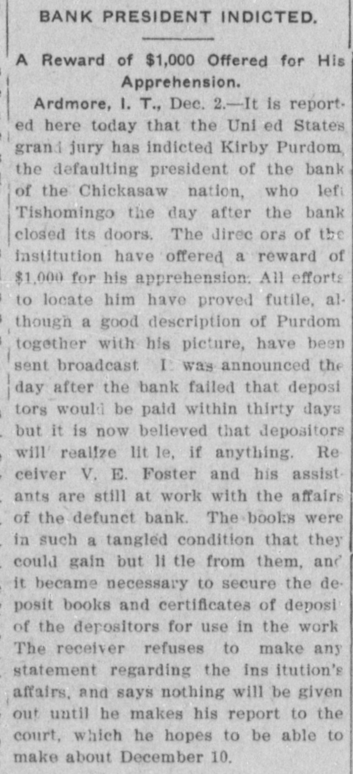 BANK PRESIDENT INDICTED. A Reward of $1,000 Offered for His Apprehension. Ardmore, 1. T., Dec. 2.-It is reported here today that the Uni ed States grand jury has indicted Kirby Purdom the defaulting president of the bank of the Chickasaw nation, who left Tishomingo the day after the bank closed its doors. The direc ors of the institution have offered a reward of $1,000 for his apprehension. All efforts to locate him have proved futile, although a good description of Purdom together with his picture, have been sent broadcast I: was announced the day after the bank failed that deposi tors would be paid within thirty days but it is now believed that depositors will realize lit le, if anything. Re ceiver V. E. Foster and his assistants are still at work with the affairs of the defunct bank. The books were in such a tangled condition that they could gain but li tle from them, and it became necessary to secure the deposit books and certificates of deposi of the depositors for use in the work The receiver refuses to make any statement regarding the ins itution's affairs, and says nothing will be given out until he makes his report to the court, which he hopes to be able to make about December 10.