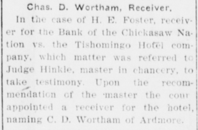 In the case of H. E. Foster, receiver for the Bank of the Chickasaw Nation vs. the Tishomingo Hotel company, which matter was referred to Judge Hinkle, master in chancery, to take testimony. Upon the recommendation of the master the court appointed a receiver for the hotel, naming C. D. Wortham of Ardmore.