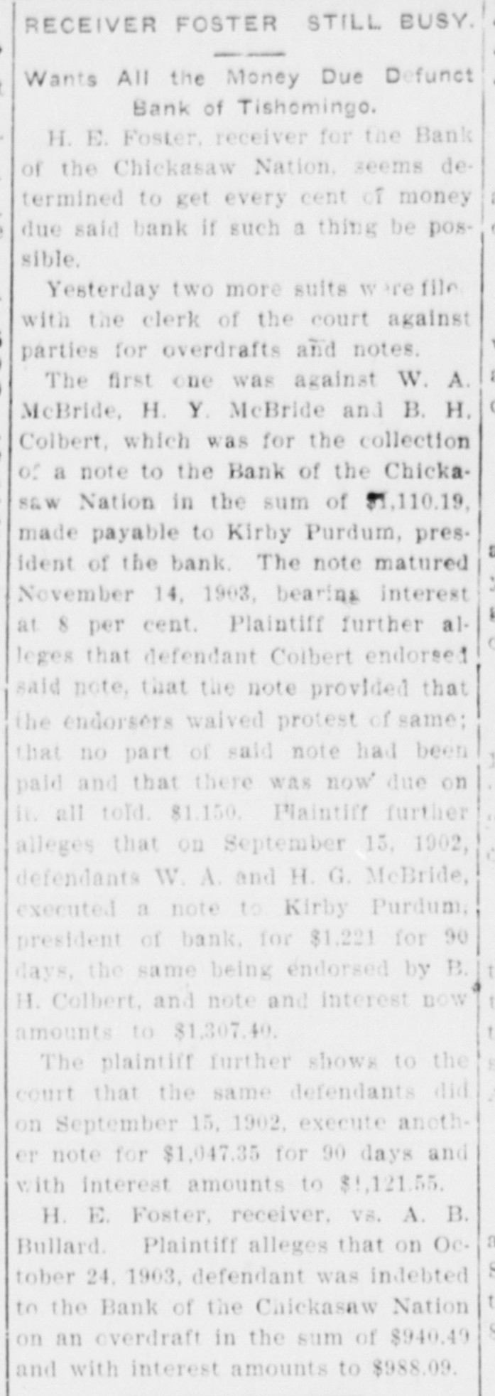 RECEIVER FOSTER STILL BUSY. Wants All the Money Due Defunct Bank of Tishomingo. H. E. Foster. receiver for the Bank of the Chickasaw Nation, seems determined to get every cent of money due said bank if such a thing be possible. Yesterday two more suits are file with the clerk of the court against parties for overdrafts and notes. The first one was against W. A. McBride, H. Y. McBride and B. H, Colbert, which was for the collection of a note to the Bank of the Chickasaw Nation in the sum of 1,110.19, made payable to Kirby Purdum, pres. ident of the bank. The note matured November 14, 1903, bearing interest at 8 per cent. Plaintiff further alleges that defendant Colbert endorsed said note, that the note provided that the endorsers waived protest of same; that no part of said note had been paid and that there was now due on it. all told. $1.150. Plaintiff further alleges that on September 15, 1902, defendants W. A. and H. G. McBride, executed a note to Kirby Purdum, president of bank. for $1,221 for 90 days, the same being endorsed by B. H. Colbert, and note and interest now amounts to $1,307.40. The plaintiff further shows to the court that the same defendants did on September 15, 1902, execute another note for $1,047.35 for 90 days and with interest amounts to $1,121.55. H. E. Foster, receiver, vs. A. B. Bullard. Plaintiff alleges that on Oc. tober 24, 1903, defendant was indebted to the Bank of the Chickasaw Nation on an overdraft in the sum of $940.49 and with interest amounts to $988.09.