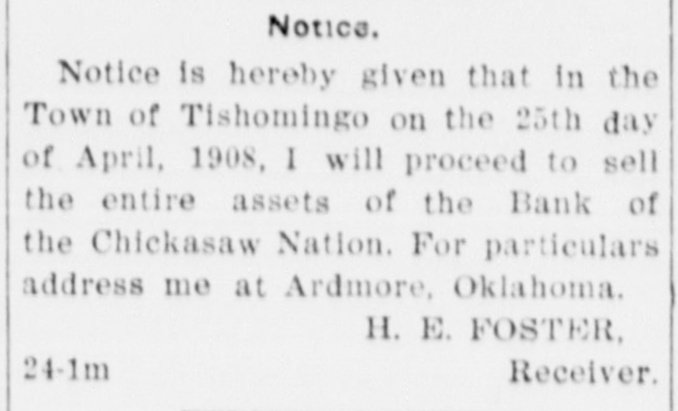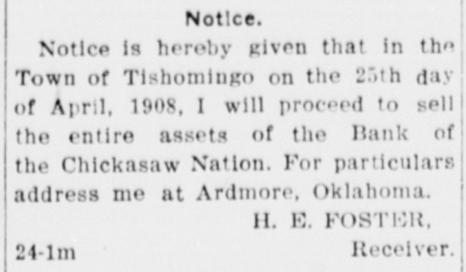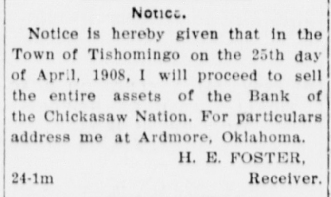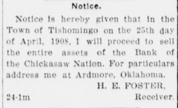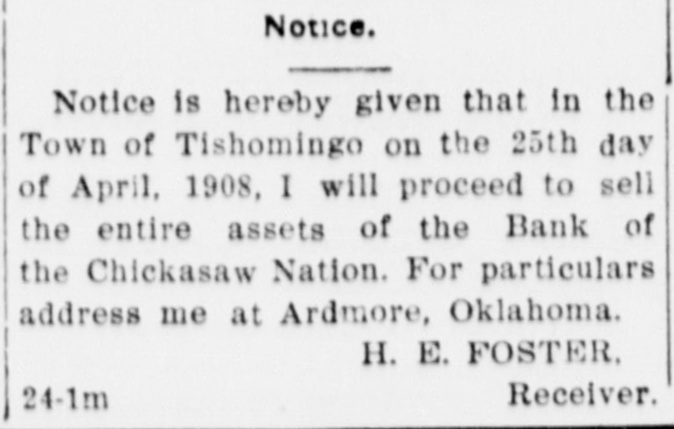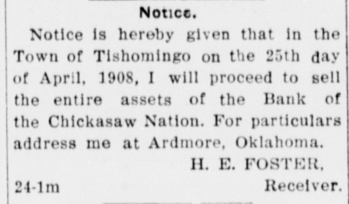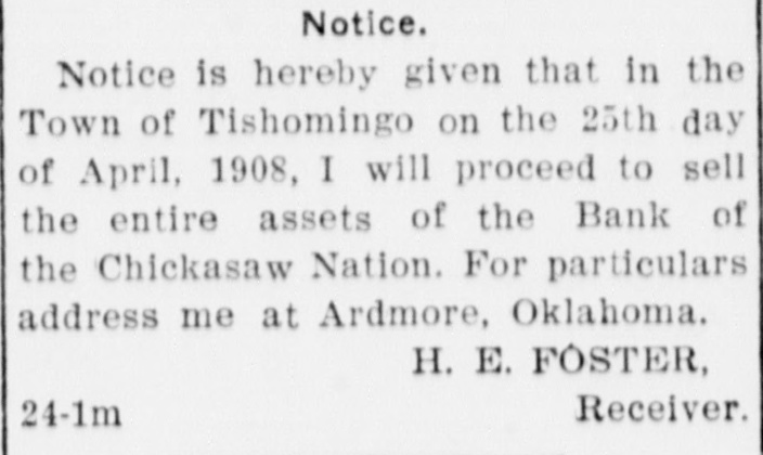 Notice. Notice is hereby given that in the Town of Tishomingo on the 25th day of April, 1908, I will proceed to sell the entire assets of the Bank of the Chickasaw Nation. For particulars address me at Ardmore, Oklahoma. H. E. FOSTER, 24-1m Receiver.