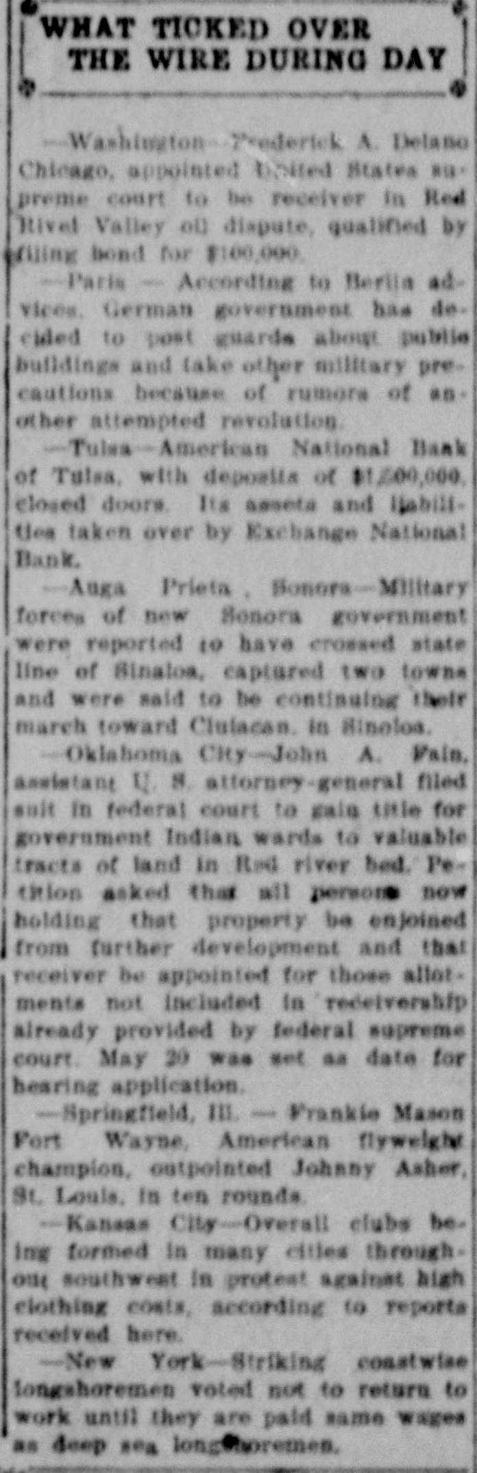 WHAT TICKED OVER THE WIRE DURING DAY Washington--rederick A. Delano Chicago, appointed libited States su preme court to be receiver in Red Rivel Valley oi) diapute, qualified by filing bond for $100,000. -Paris - According to Berlia ad. vices, German government has decided to post guards about public buildings and take other military precautions because of rumora of another attempted revolution -Tulss-American National Bank of Tulsa, with deposits of $1,500,000. closed doors. Its asseta and Habilities taken over by Exchange National Bank. -Auga Prieta . Bonora can Military forces of new Sonora government were reported to have crossed state line of Sinaloa, captured two towns and were said to be continuing their march toward Clutacan. in Rinoloa. -Oklahoma City-John A. Fain, aneletant 4. 8. attorney-general filed suit in federal court to gain title for government Indian wards to valuable tracts of land in Red river bed. Pecition asked that all persons now holding that property be enjoined from further development and that receiver be appointed for those allotments not included in receivership already provided by federal supreme court. May 20 was set as date for hearing application. -Springfield, III. - Frankie Mason Fort Wayne, American flyweight champion, outpointed Johnny Asher, St. Louis, in ten rounds. -Kansas City Overall clubs be. ing formed in many cities through out southwest in protest against high clothing costs, according to reports received here. -New York-Striking coastwise longshorement voted not to return to work until they are paid name wages as deep sea long-horemen.