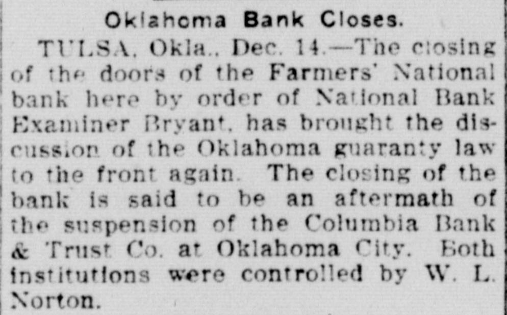 Oklahoma Bank Closes. TULSA. Okla.. Dec. 14.-The closing of the doors of the Farmers' National bank here by order of National Bank Examiner Bryant, has brought the discussion of the Oklahoma guaranty law to the front again. The closing of the bank is said to be an aftermath of the suspension of the Columbia Bank & Trust Co. at Oklahoma City. Both institutions were controlled by W. L. Norton.