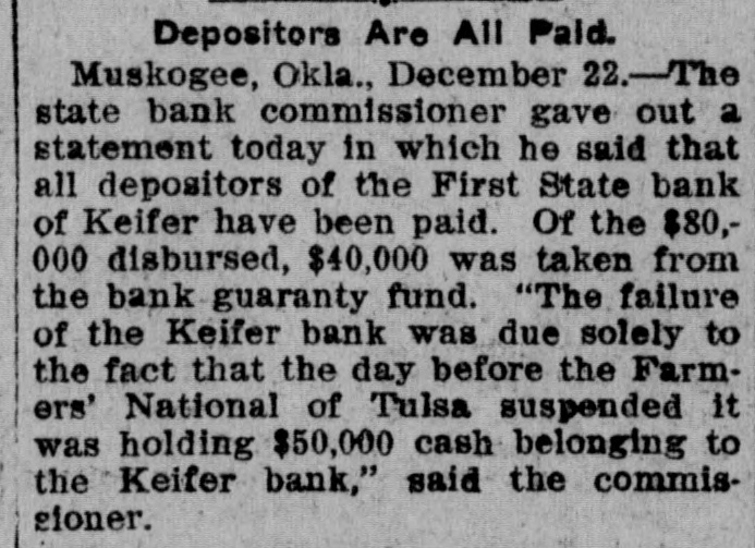 Depositors Are All Paid. Muskogee, Okla., December 22.-The state bank commissioner gave out a statement today in which he said that all depositors of the First State bank of Keifer have been paid. Of the $80,000 disbursed, $40,000 was taken from the bank guaranty fund. "The failure of the Keifer bank was due solely to the fact that the day before the Farmers' National of Tulsa suspended it was holding $50,000 cash belonging to the Keifer bank," said the commissioner.