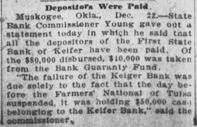 Depositors Were Paid. Muskogee, Okla., Dec. 22.-State Bank Commissioner Young gave out a statement today in which he said that all the depositors of the First State Bank of Reifer have been paid. Of the $80,000 disbursed, $40,000 was taken from the Bank Guaranty Fund. "The failure of the Keiger Bank was due solely to the fact that the day before the Farmers' National of Tulsa suspended, it was holding $50,000 cash belonging to the Keifer Bank," said the commissioner,
