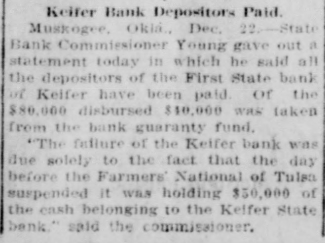 ALL DEPOSITORS PAID. Oklahoma Guaranty Fund Gives Up $40,000 to Keifer Bank. Muskogee, Okla.-State Bank Examiner Young has given out a statement in which he said that all the depositors of the First State Bank of Keifer have been paid. Of the $80,000 disbursed $40,000 was taken from the bank guaranty fund. "The failure of the Keifer Bank was due solely to the fact that the day before the Farmers' National of Tulsa suspended, it was holding $50,000 cash belonging to the Keifer Bank," said the commissioner.